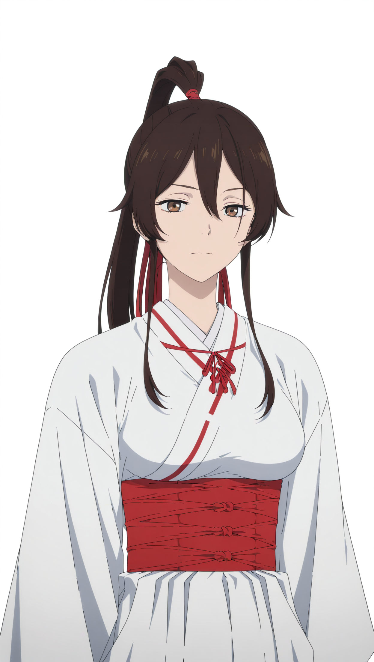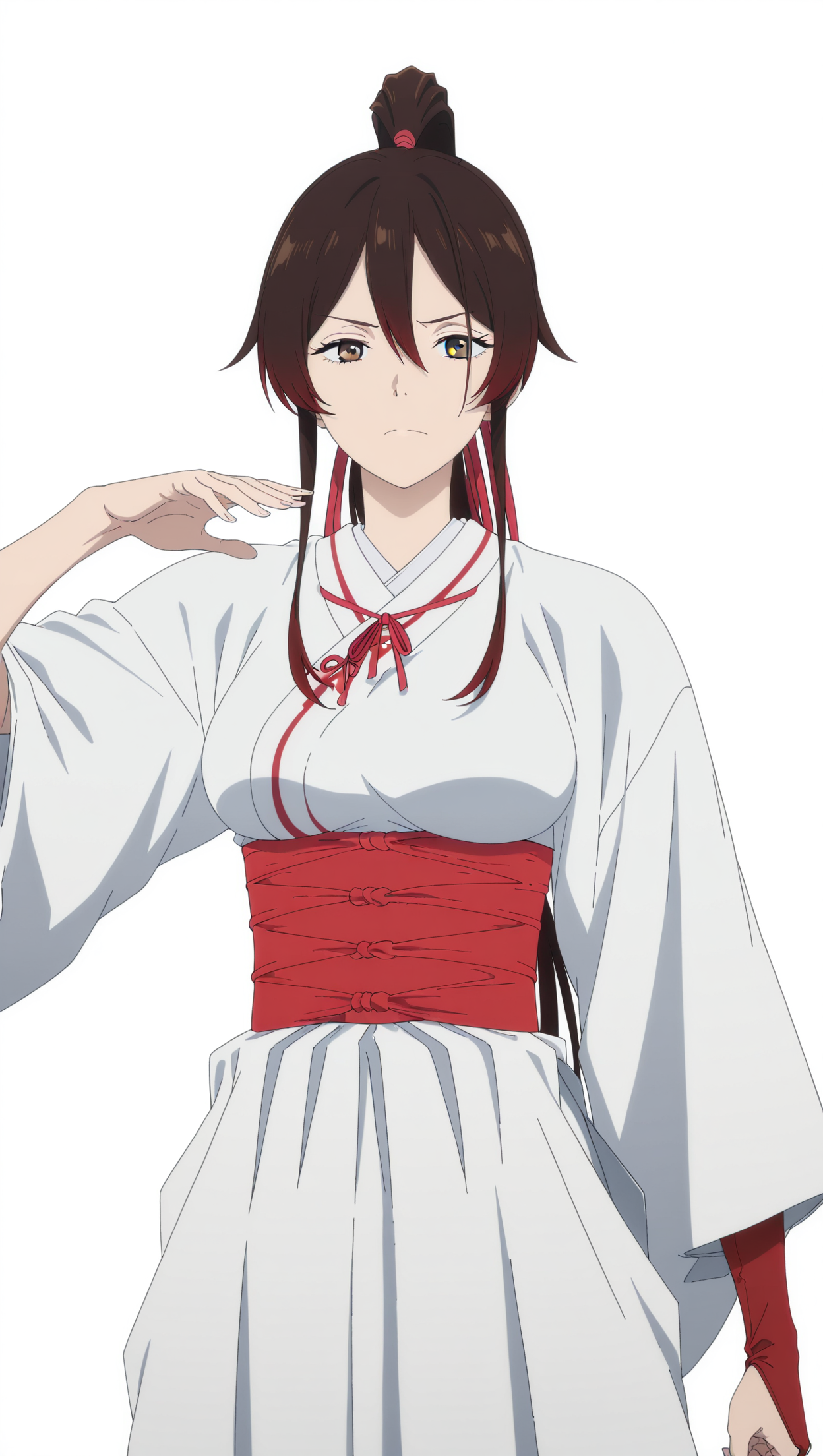 anime coloring, masterpiece, best quality, amazing quality, sagiri, 1girl, long hair, high ponytail, brown hair, brown eyes, medium breasts, hair ribbon, red hair ribbon:1.2, japanese clothes, kimono, red shash, sash, single sleeve, red single sleeve, sandals, solo, pose, standing, looking at viewer, from front, ((((white background, simple background))))
