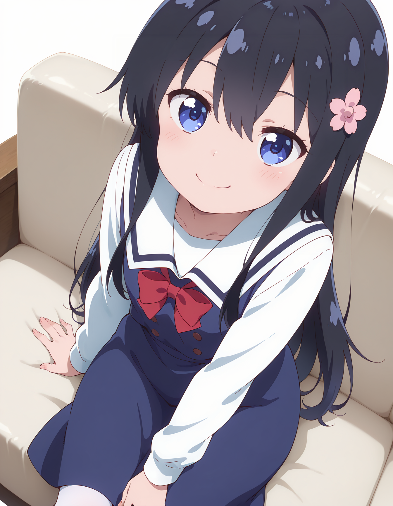 blue eyes,double-parted bangs,hair flower,black hair,long hair,