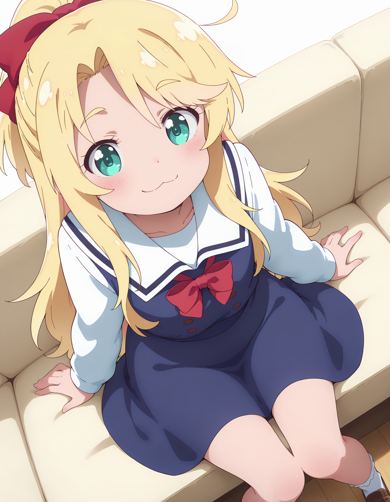 aqua eyes,:3,parted bangs,blonde hair,long hair,half updo,short ponytail,ahoge,red hairbow,