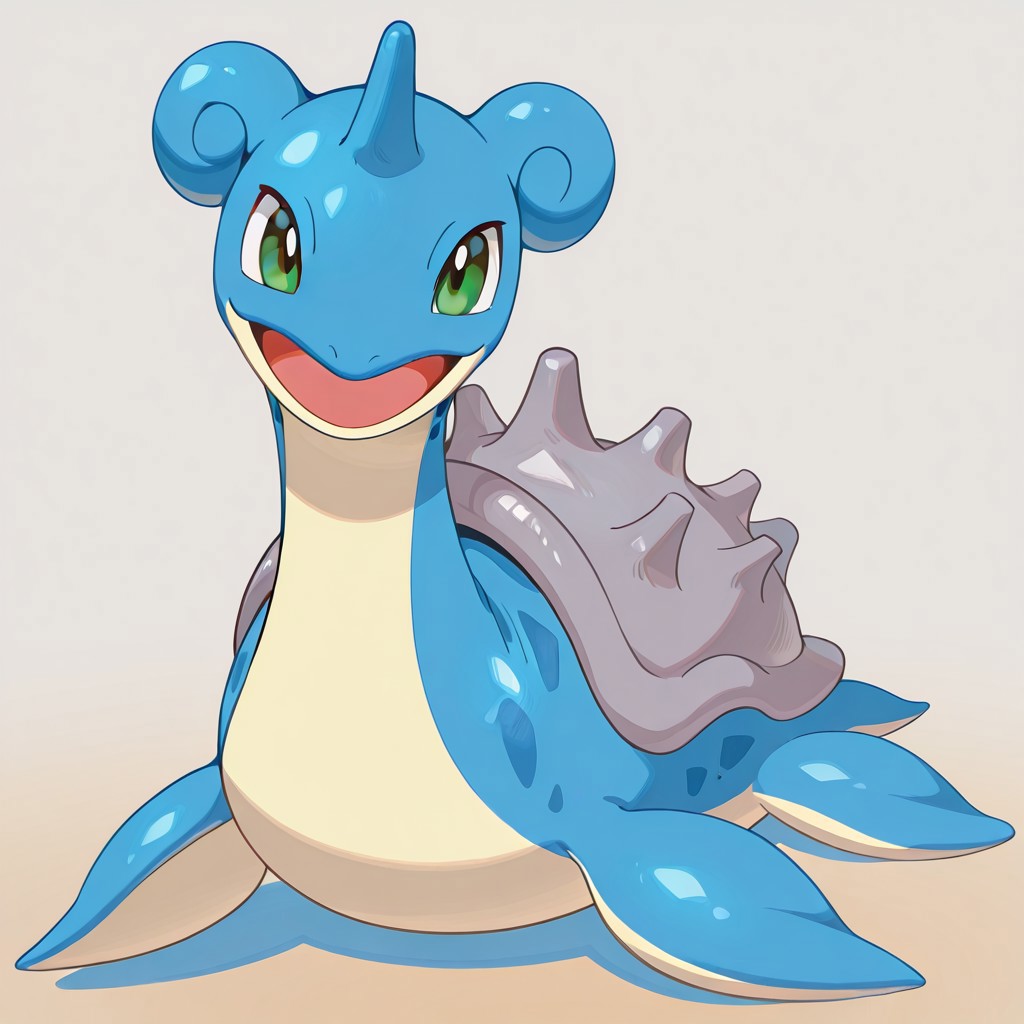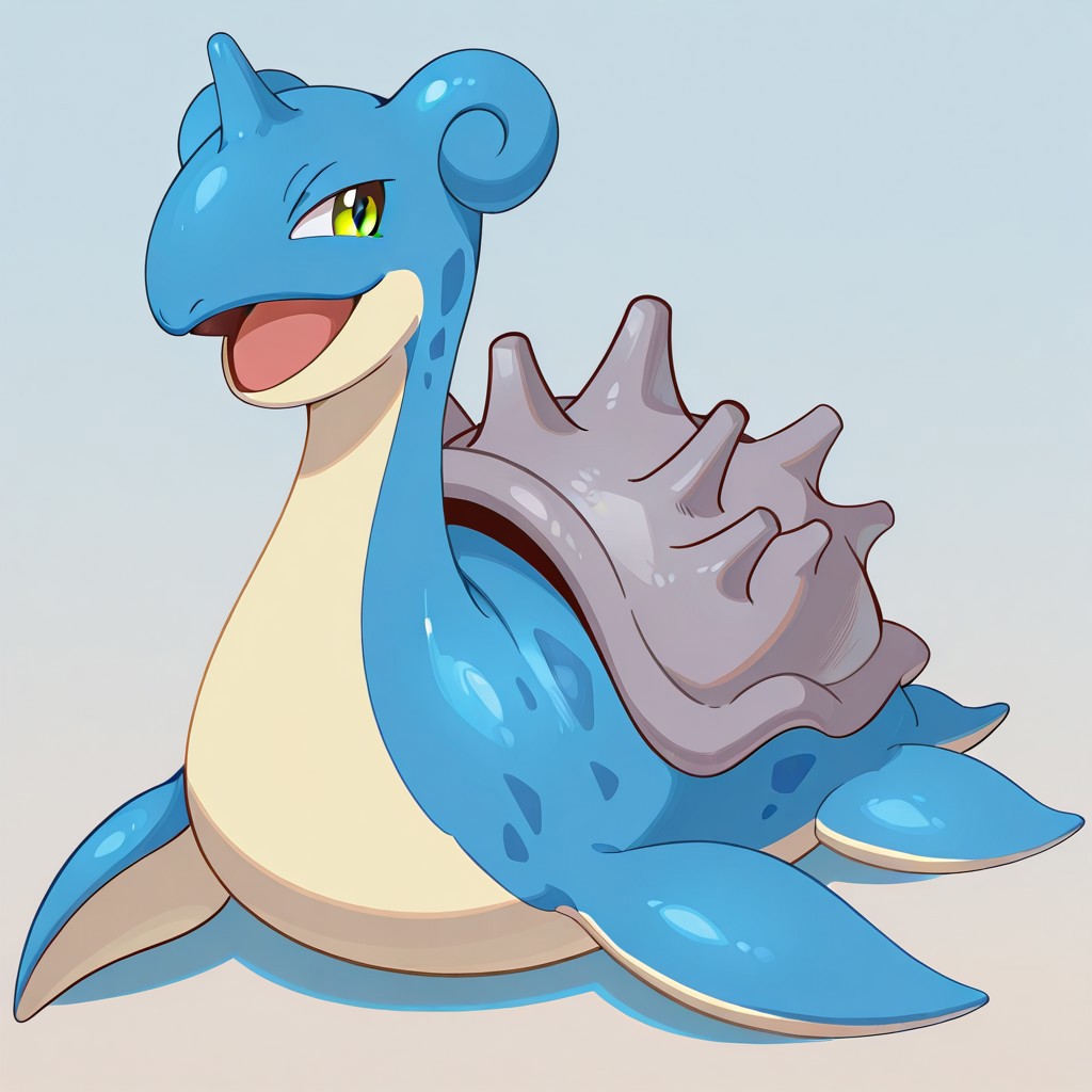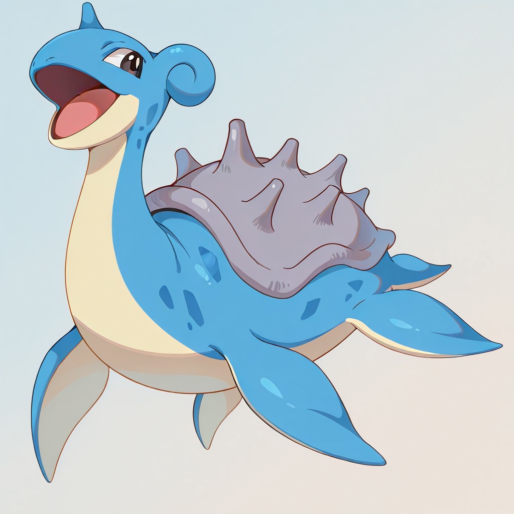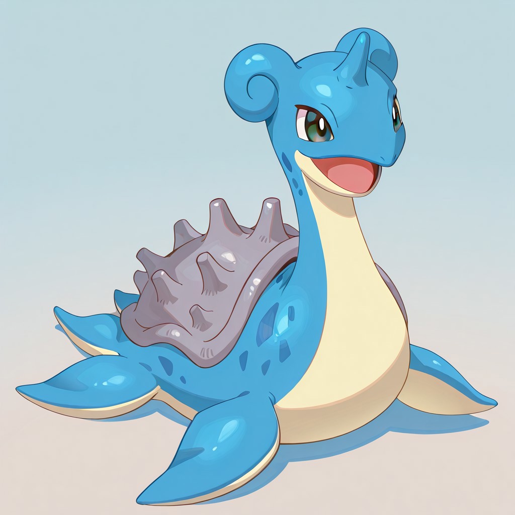 lapras, pokemon (creature), plesiosaur, blue skin, dark blue spots, cream-colored belly, gray shell on back, four flippers, brown eyes