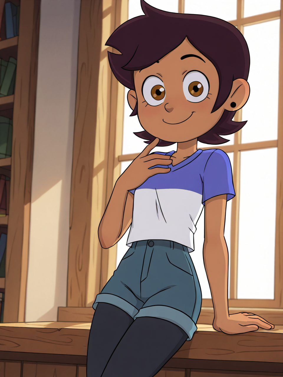LuzN0c3d4, solo, 1girl, short hair, brown hair, dark-skinned female, brown eyes, shirt, black pantyhose, blue shorts, legwear under shorts,