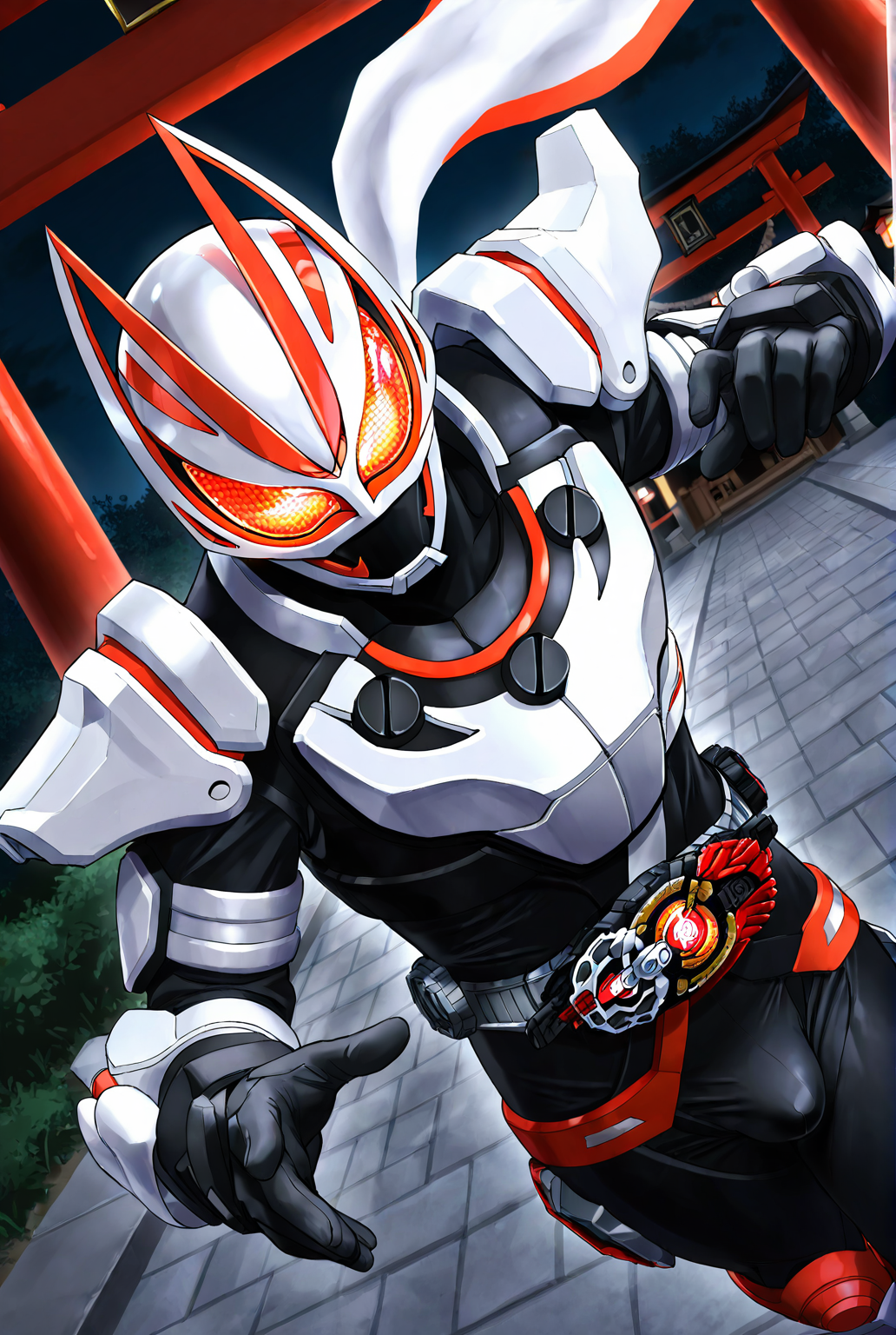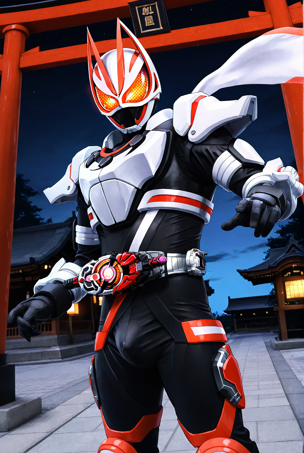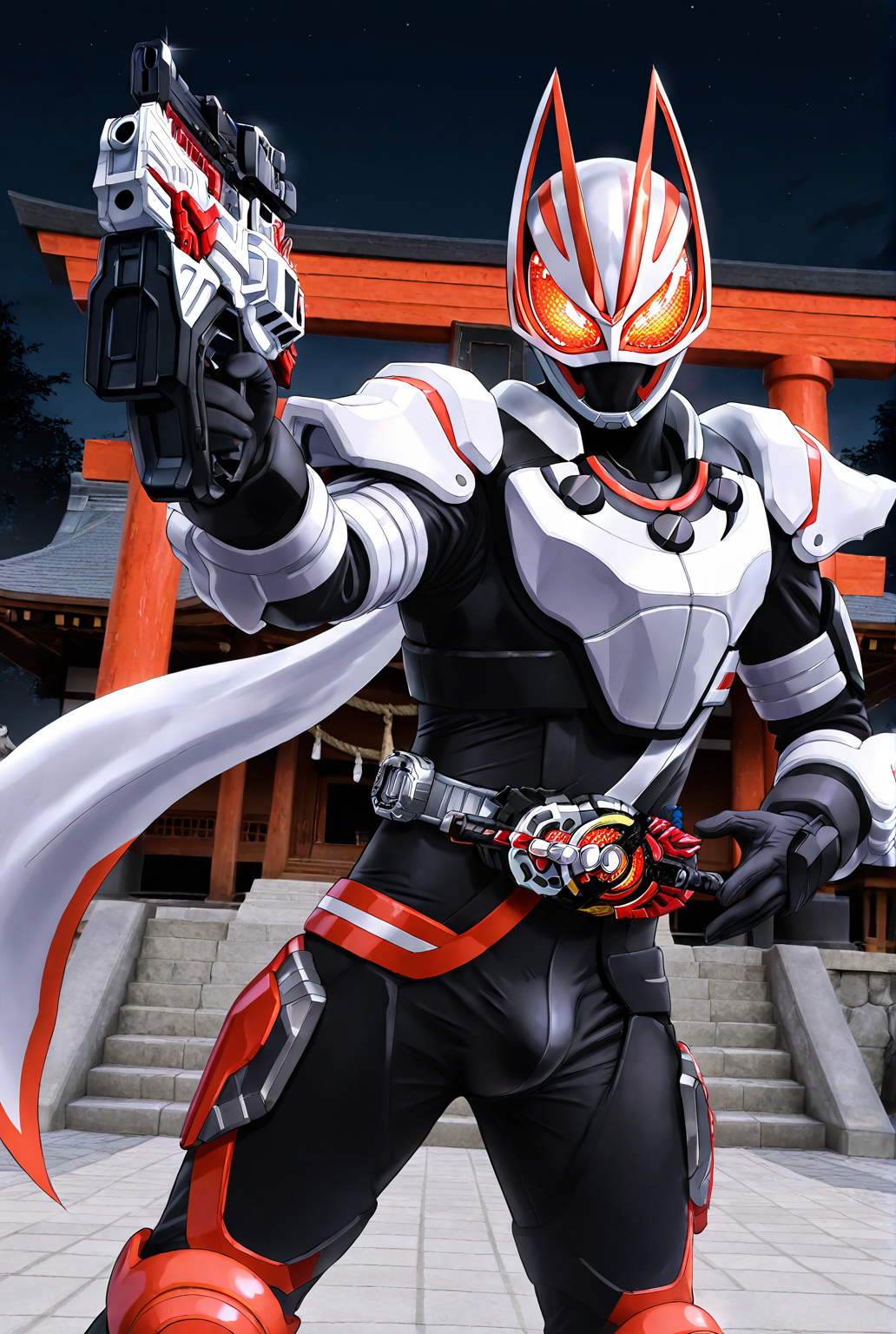 kamen rider g34ts, armor, fox ears, fox mask, mask, tokusatsu, bodysuit, fox, white armor, kitsune, scarf, black bodysuit, black gloves, gloves, belt, rider belt, helmet, boots