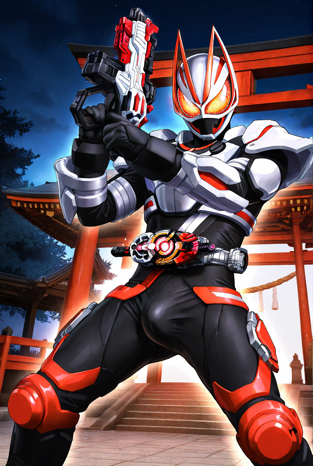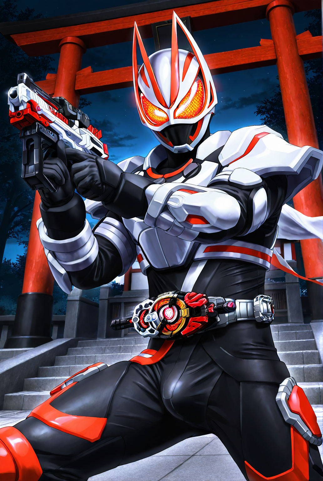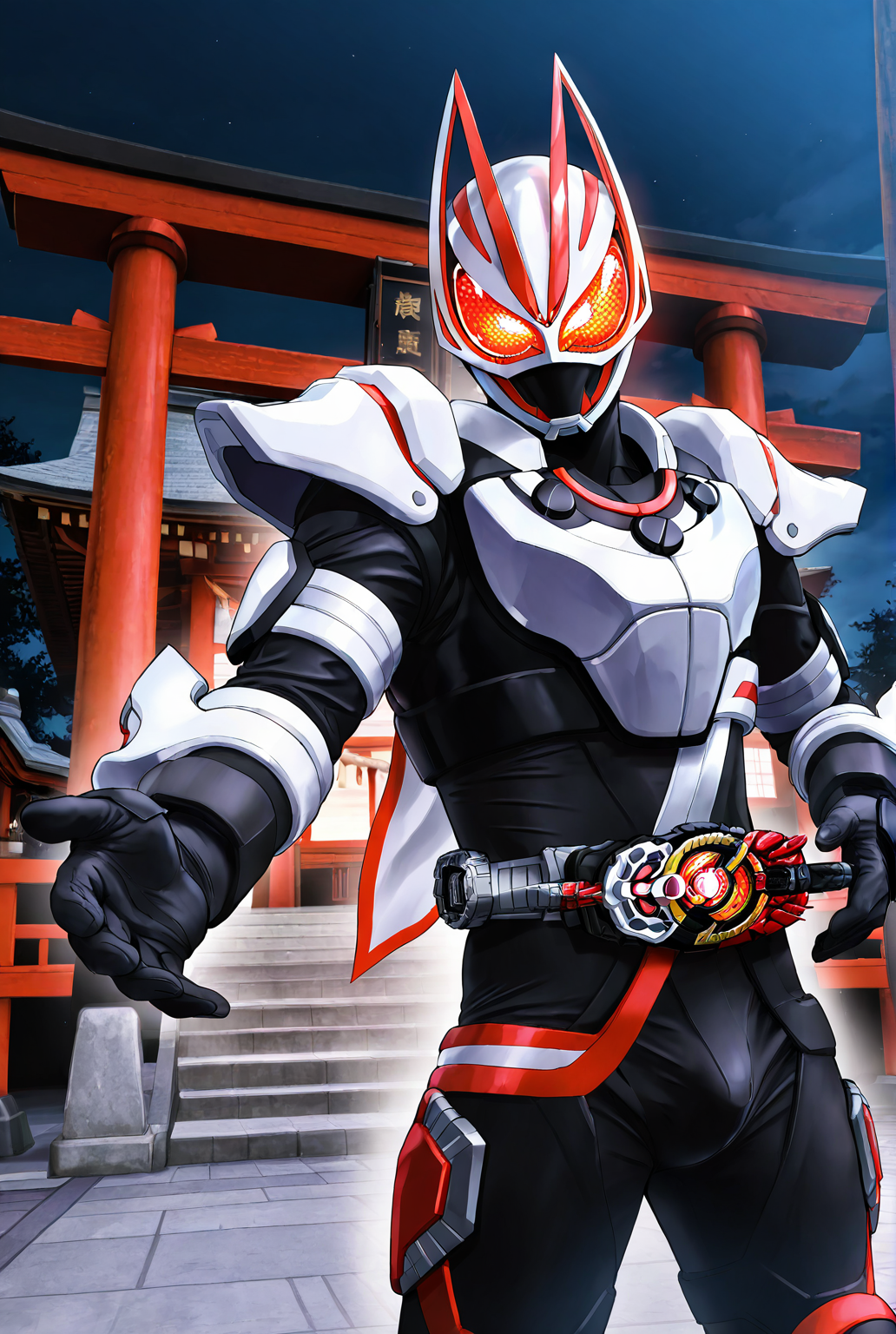 kamen rider g34ts, armor, fox ears, fox mask, mask, tokusatsu, bodysuit, fox, white armor, kitsune, scarf, black bodysuit, black gloves, gloves, belt, rider belt, helmet, boots