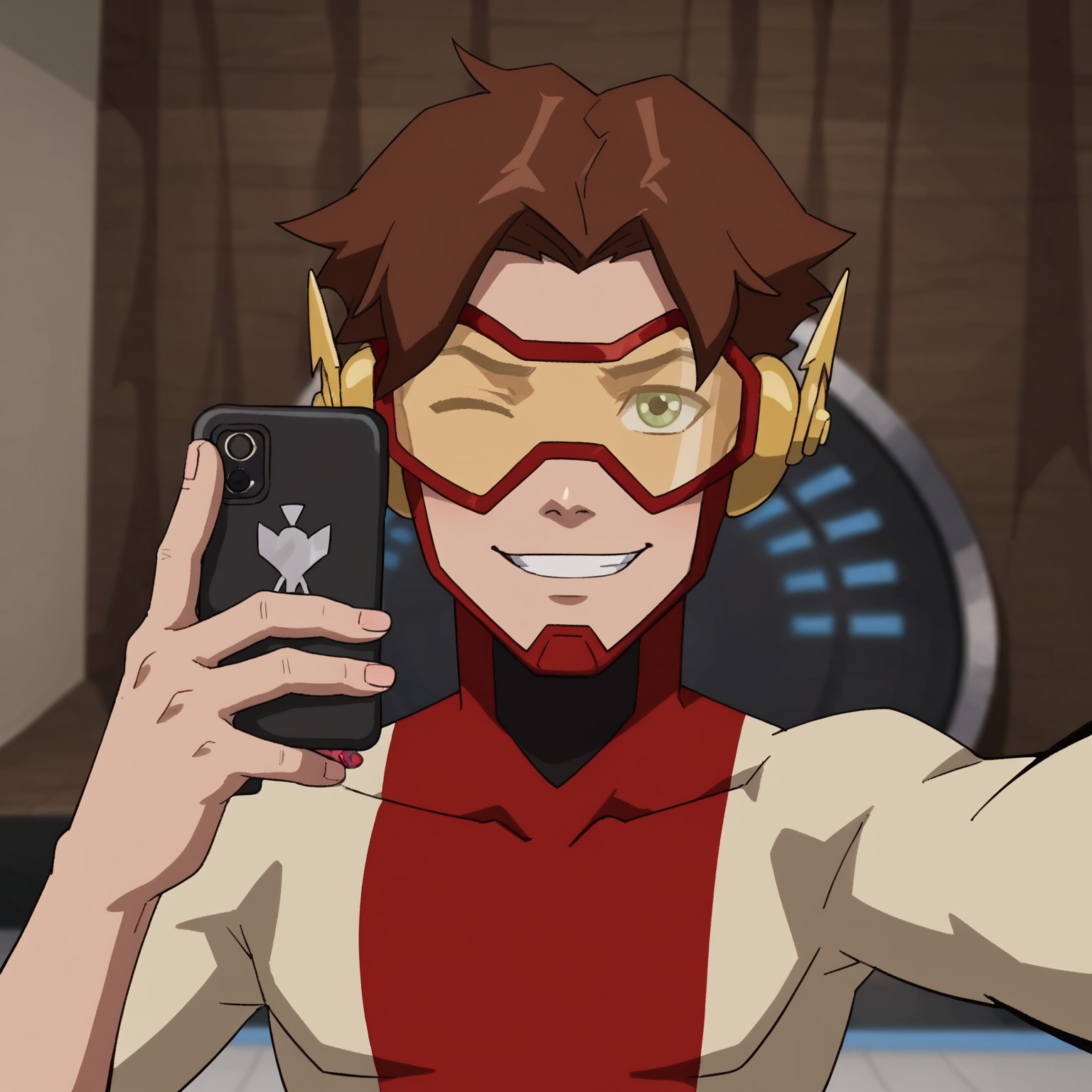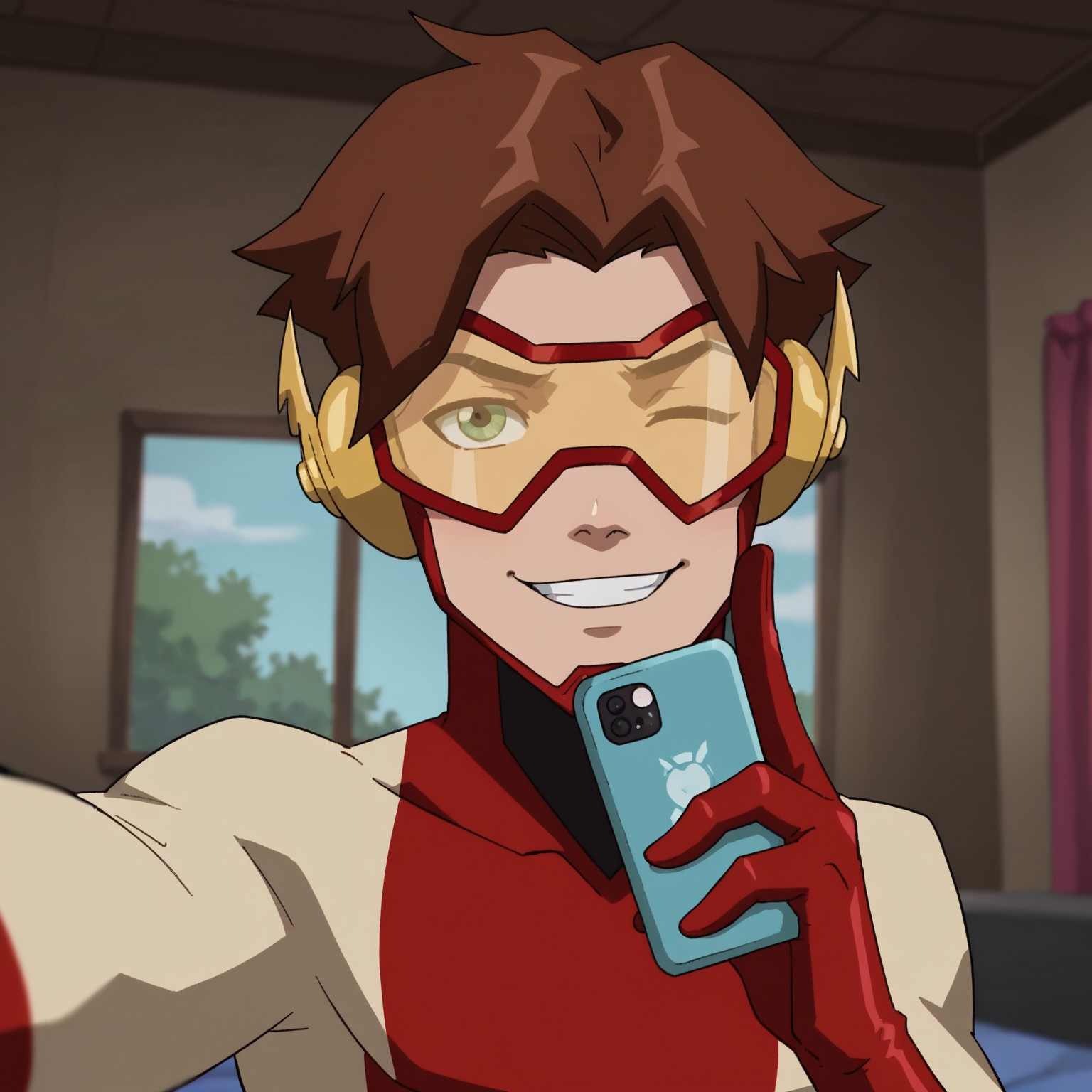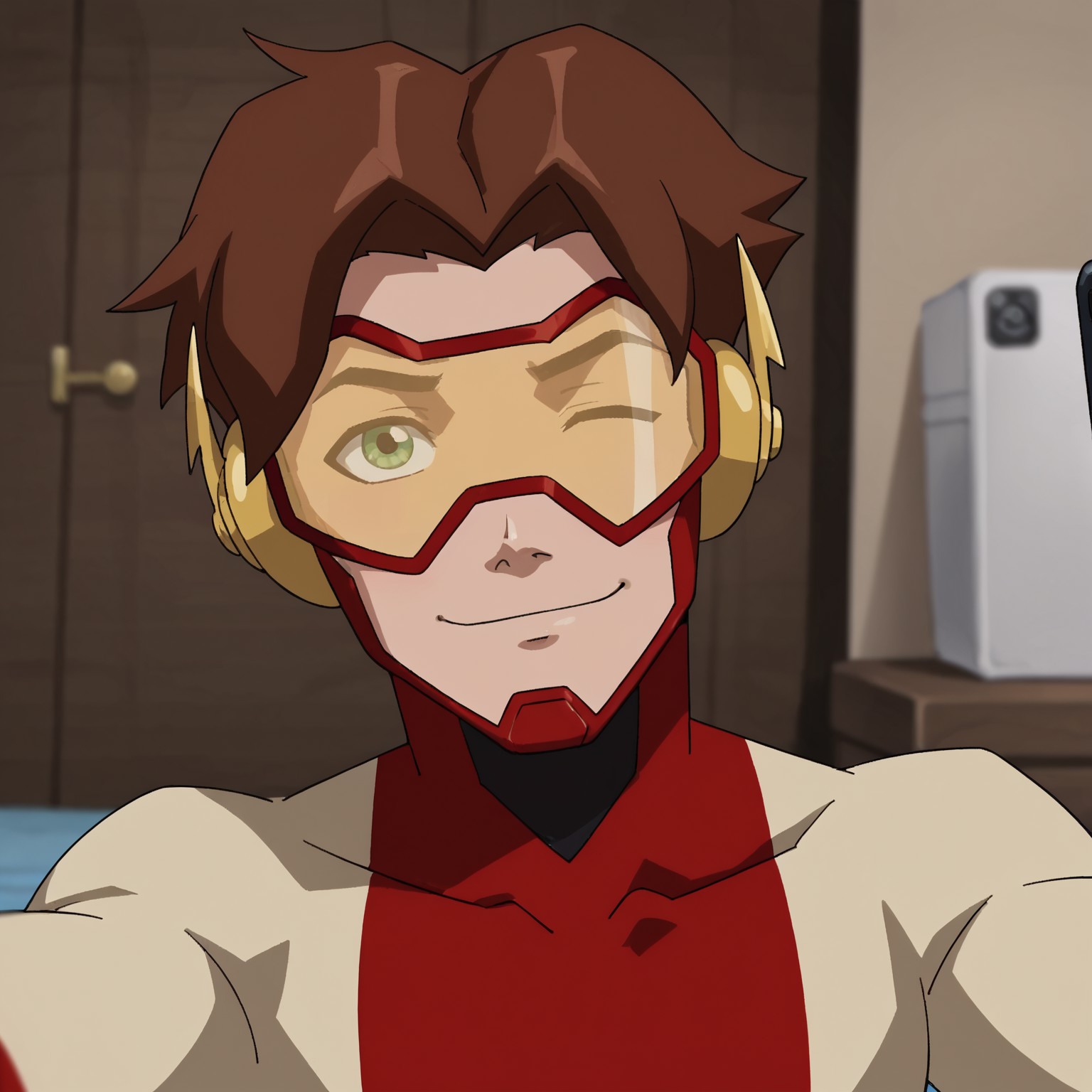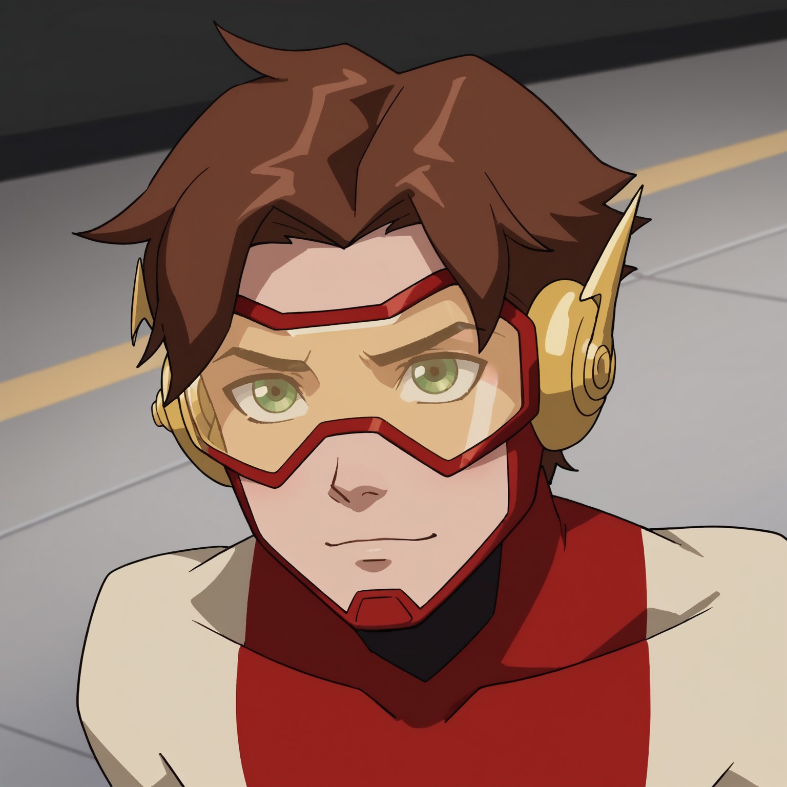 impulse, yj, green eyes, red and white costume, yellow goggles, brown hair