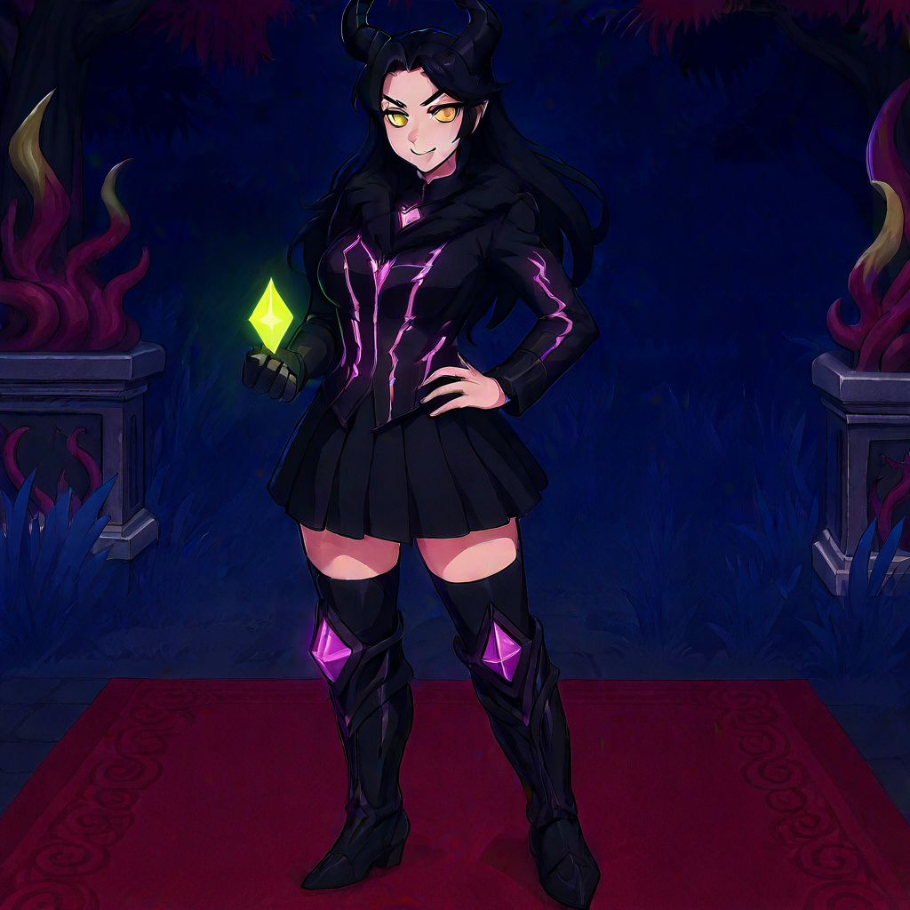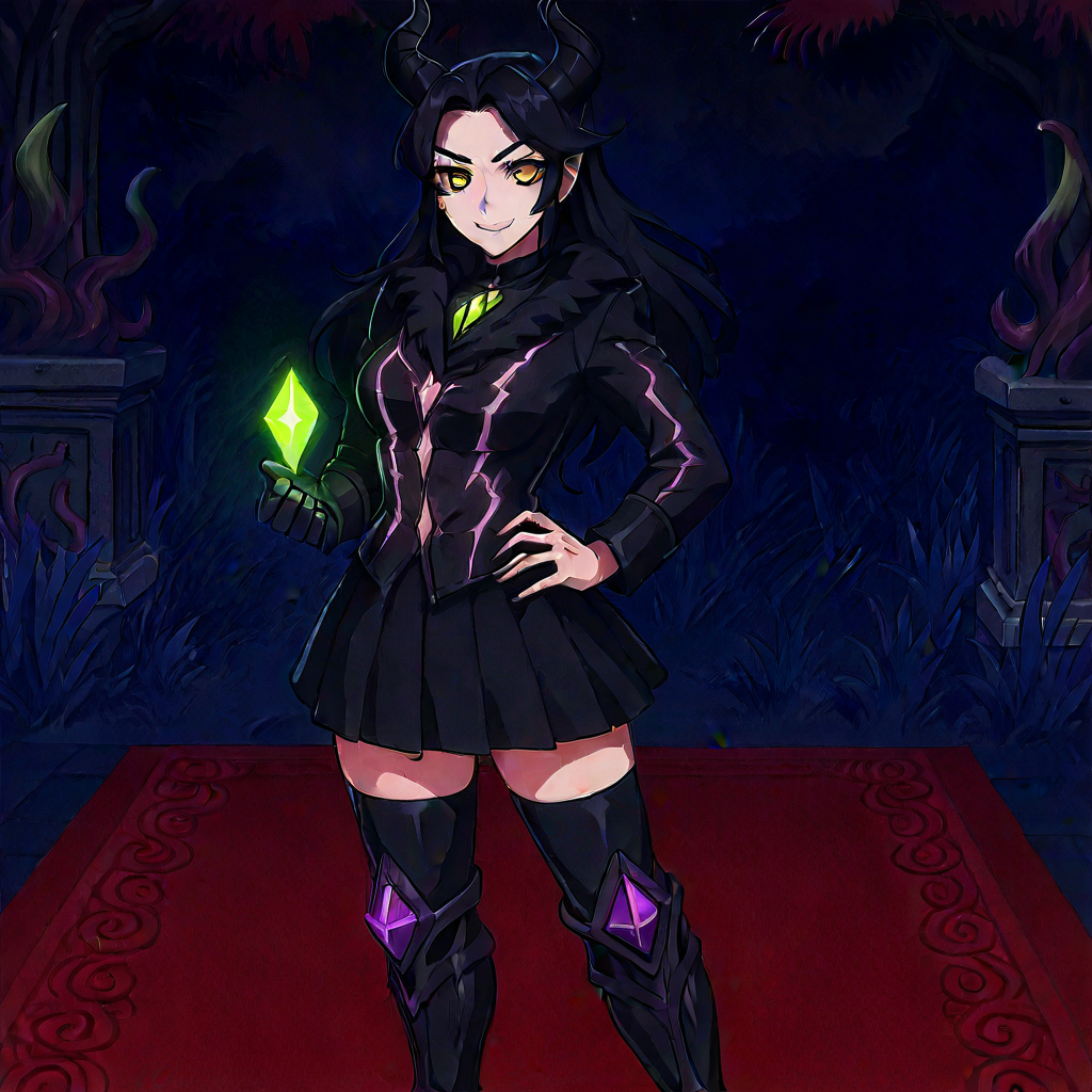 female demoness, yellow eyes, long black hair, black horns, black gothic outfit with glowing pink patterns, pleated skirt, thigh-high armored boots with purple gems, holding glowing green crystal, confident expression, standing on red carpet in mystical gothic garden, stone pillars, twisted plants, night sky