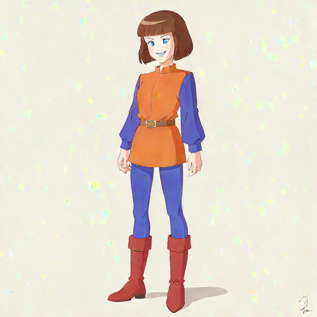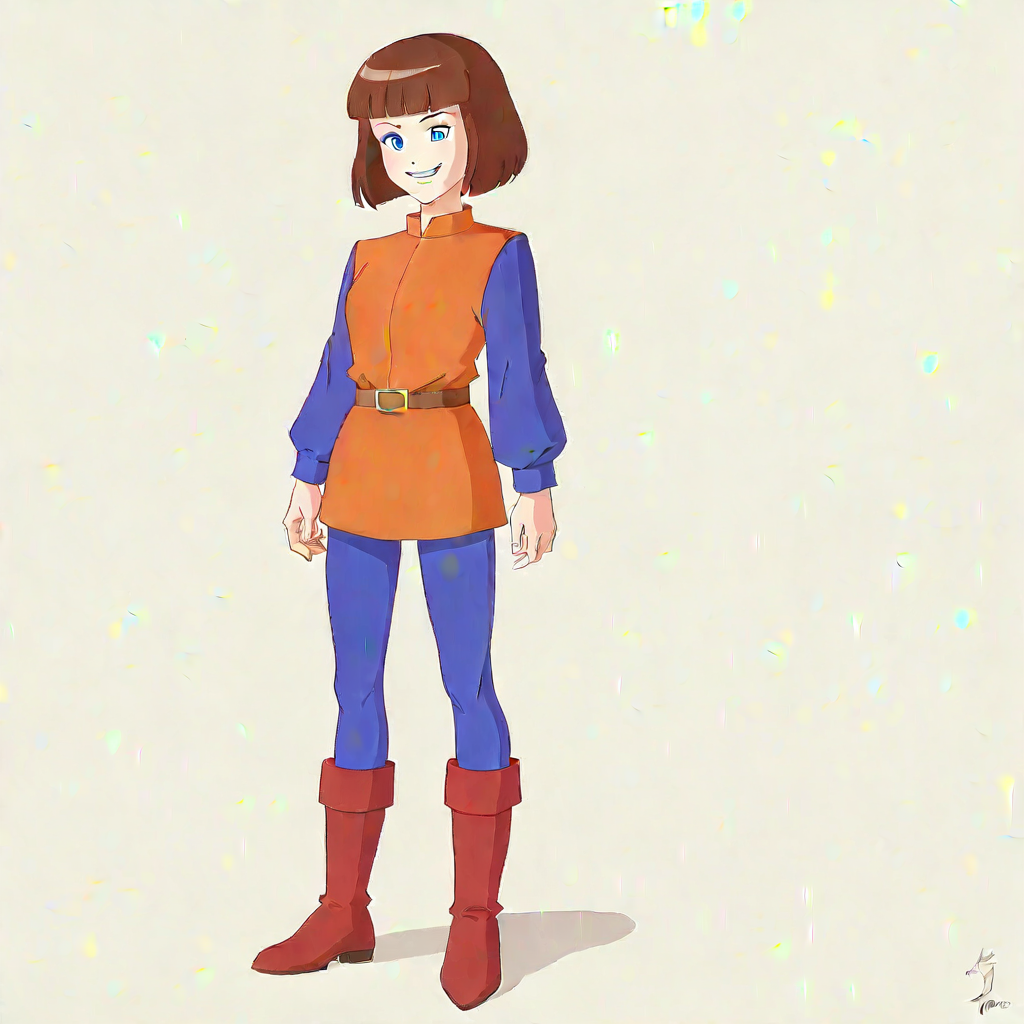 rebecca,1girl, solo, fair skin, blue eyes, brown hair ,bob cut hair, orange tunic, blue long sleeves ,blue leggings, red leather boots, standing, brown belt, happy smile,