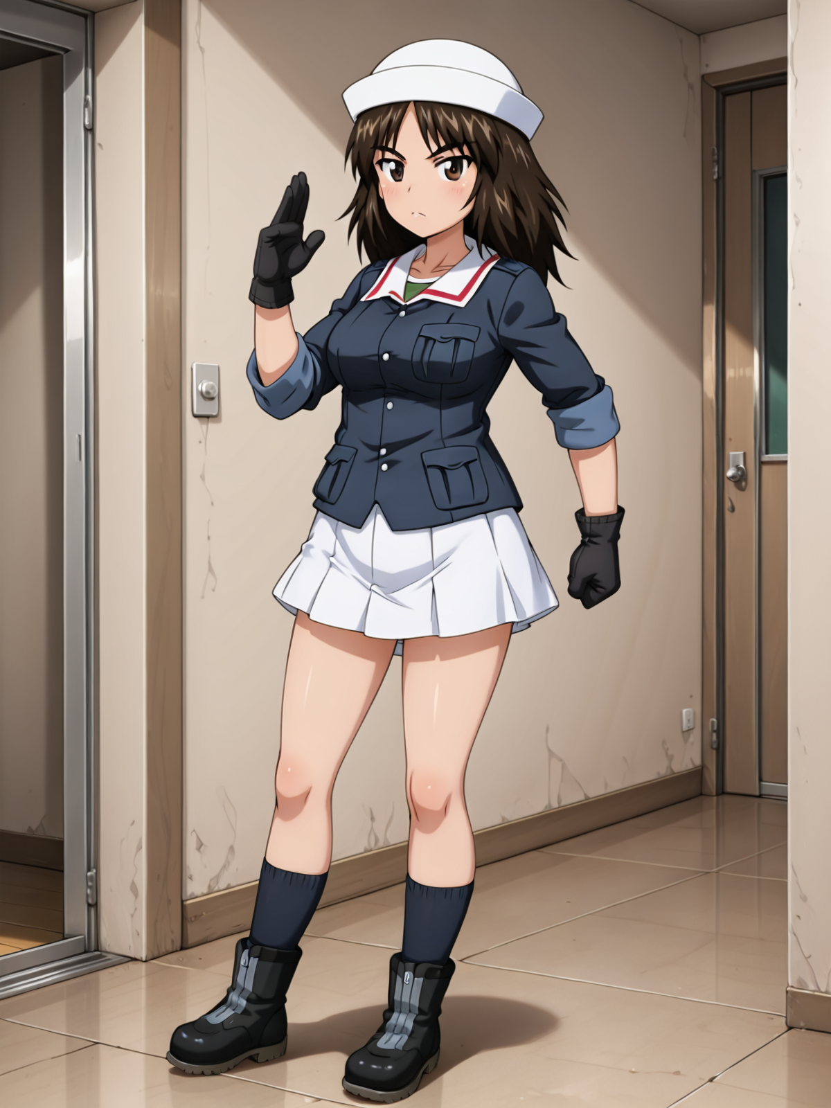 ★ooarai military uniform,dixie cup hat,black gloves,black socks,ankle boots,black boots,