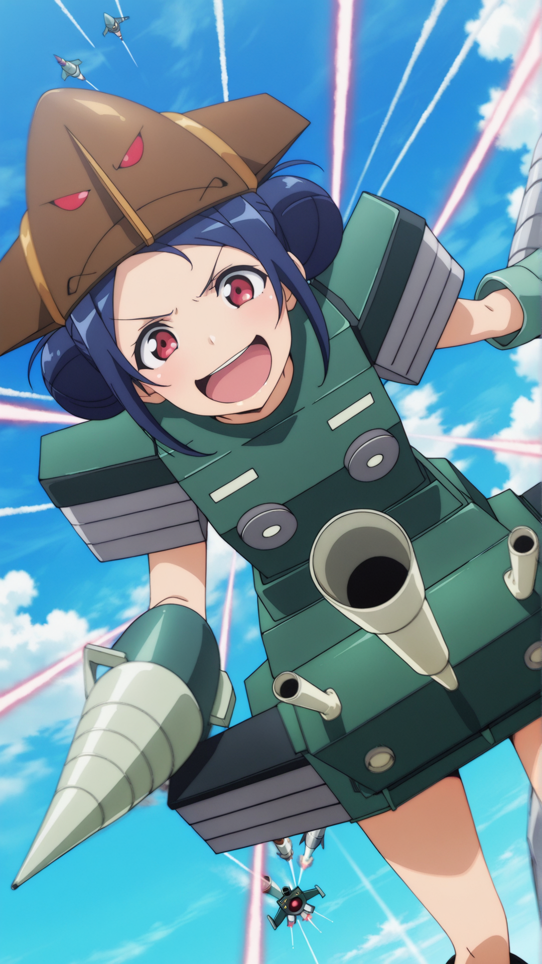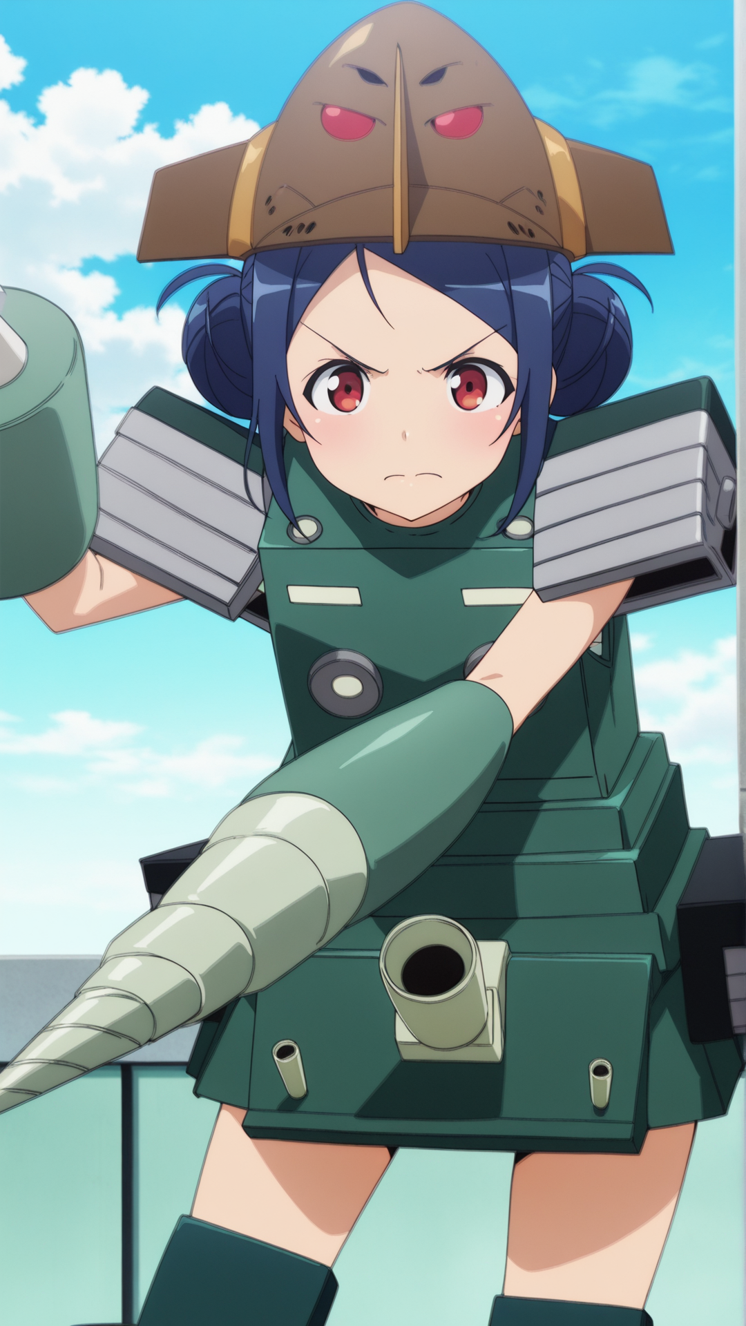 Appearance:blue hair, red eyes, double bun, v-shaped eyebrows,helmet, cannon, arm drill,