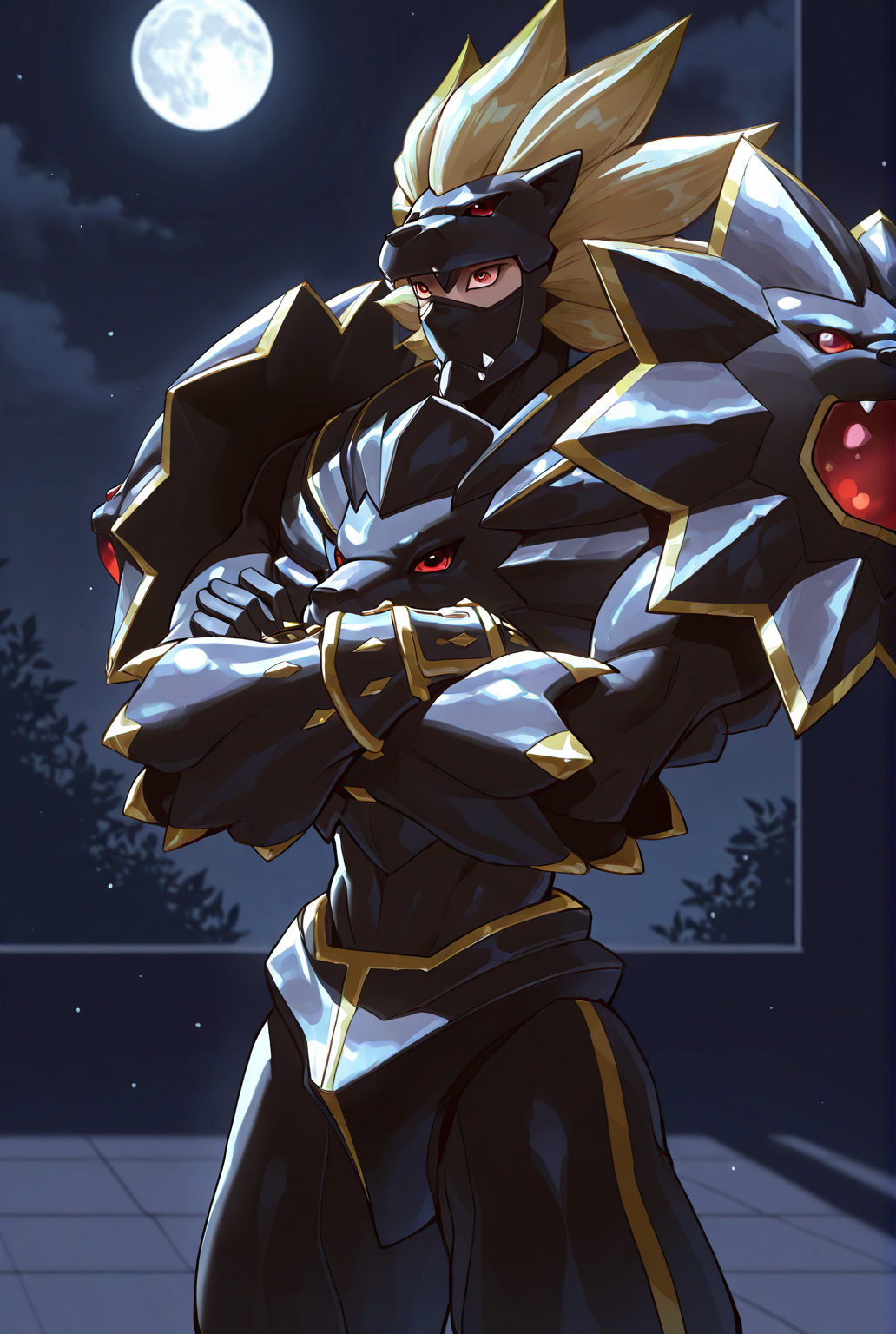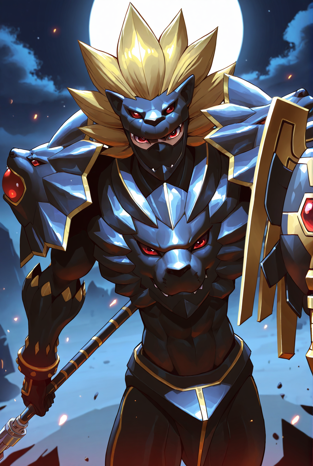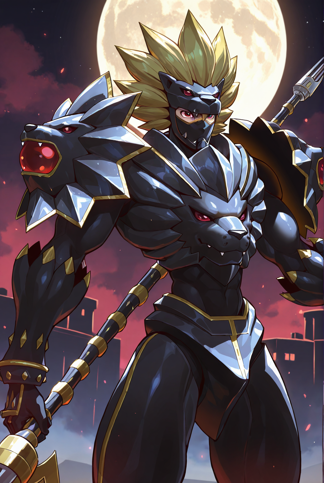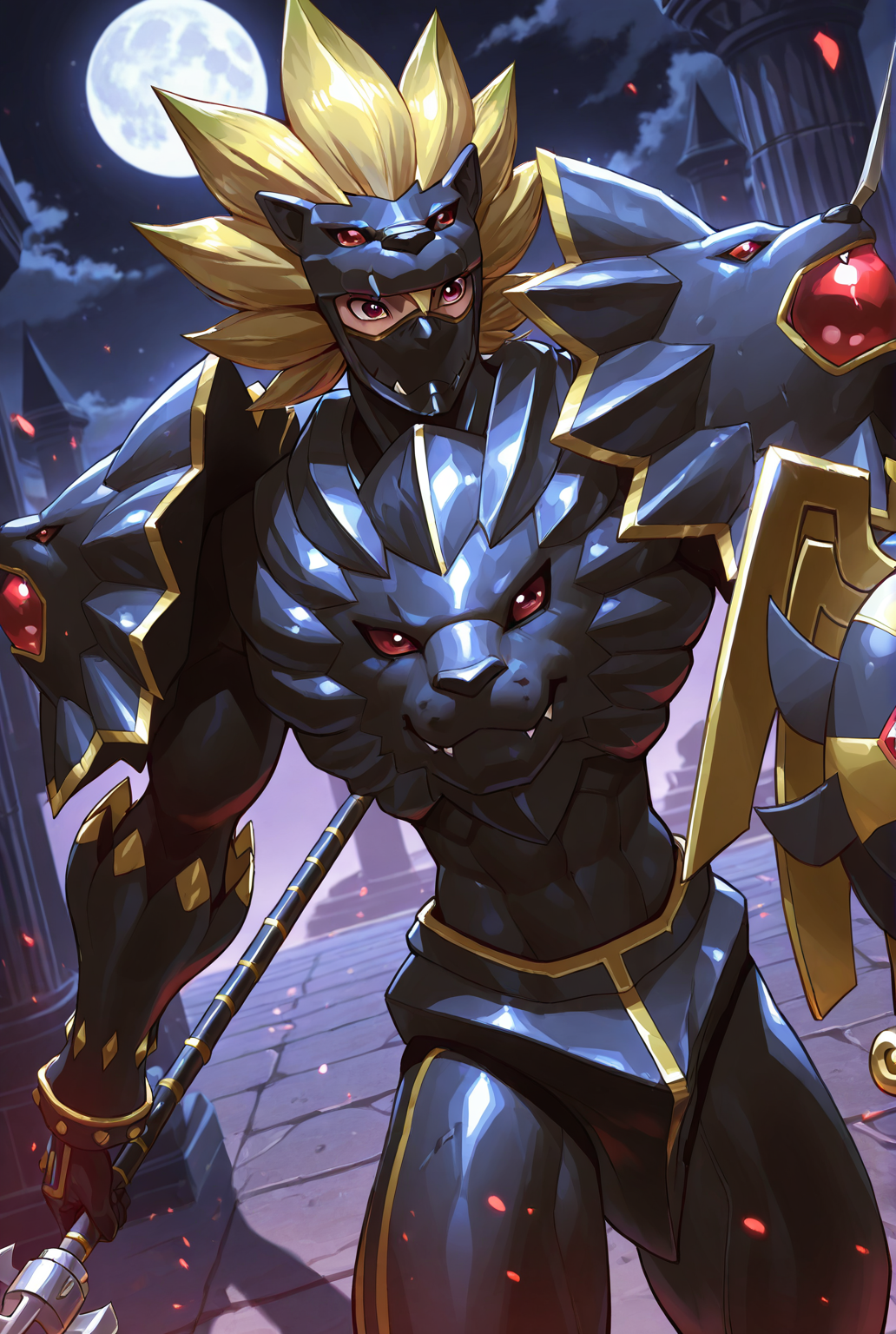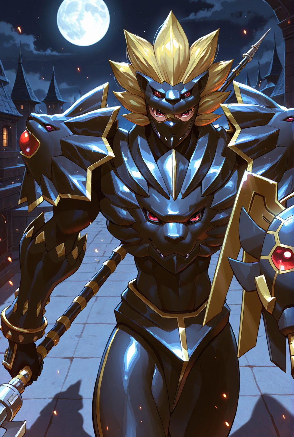 l0wem0n, digimon, blonde hair, red eyes, black armor, shoulder armor, boots