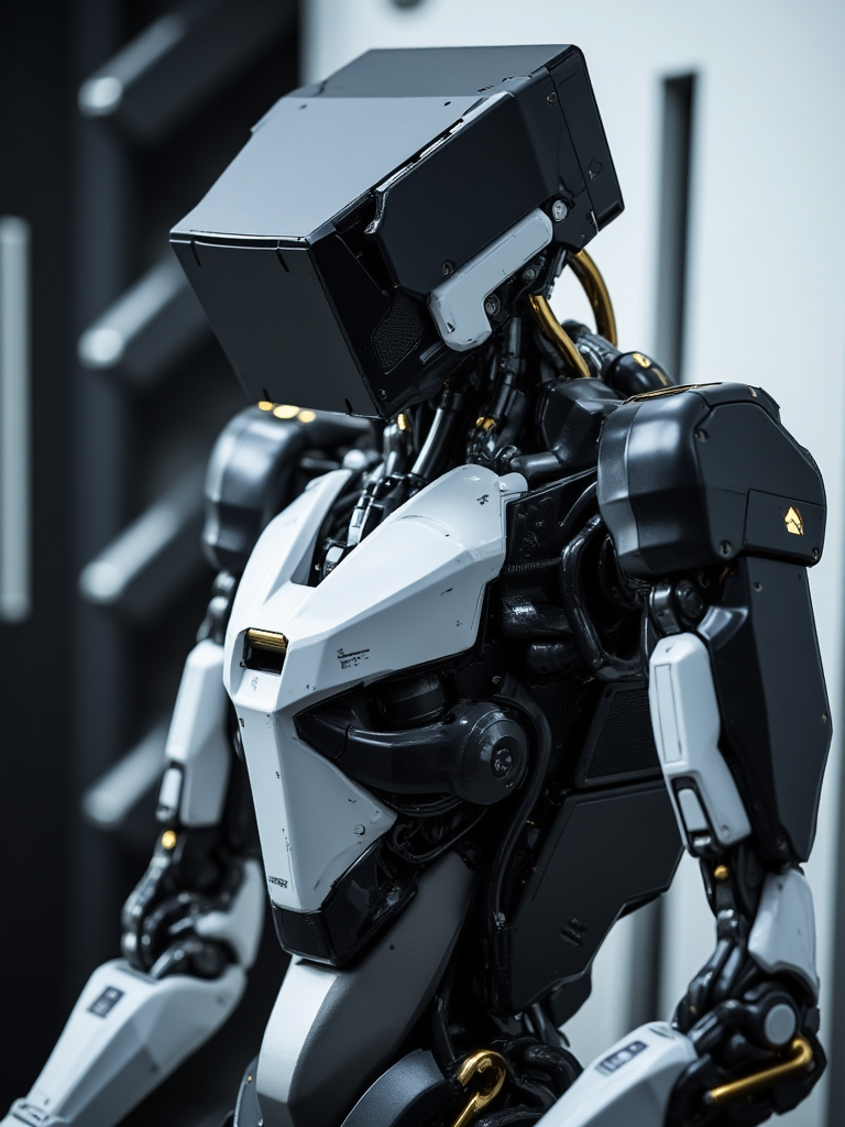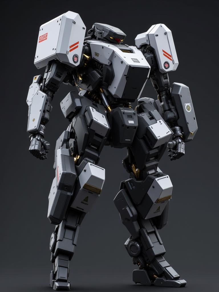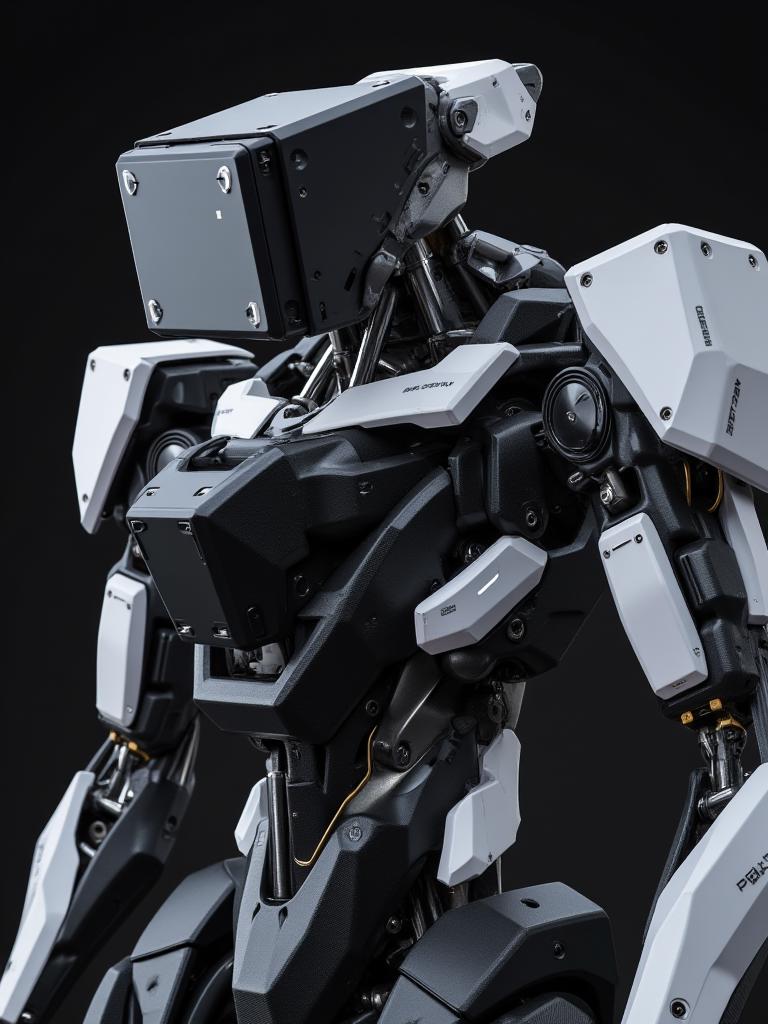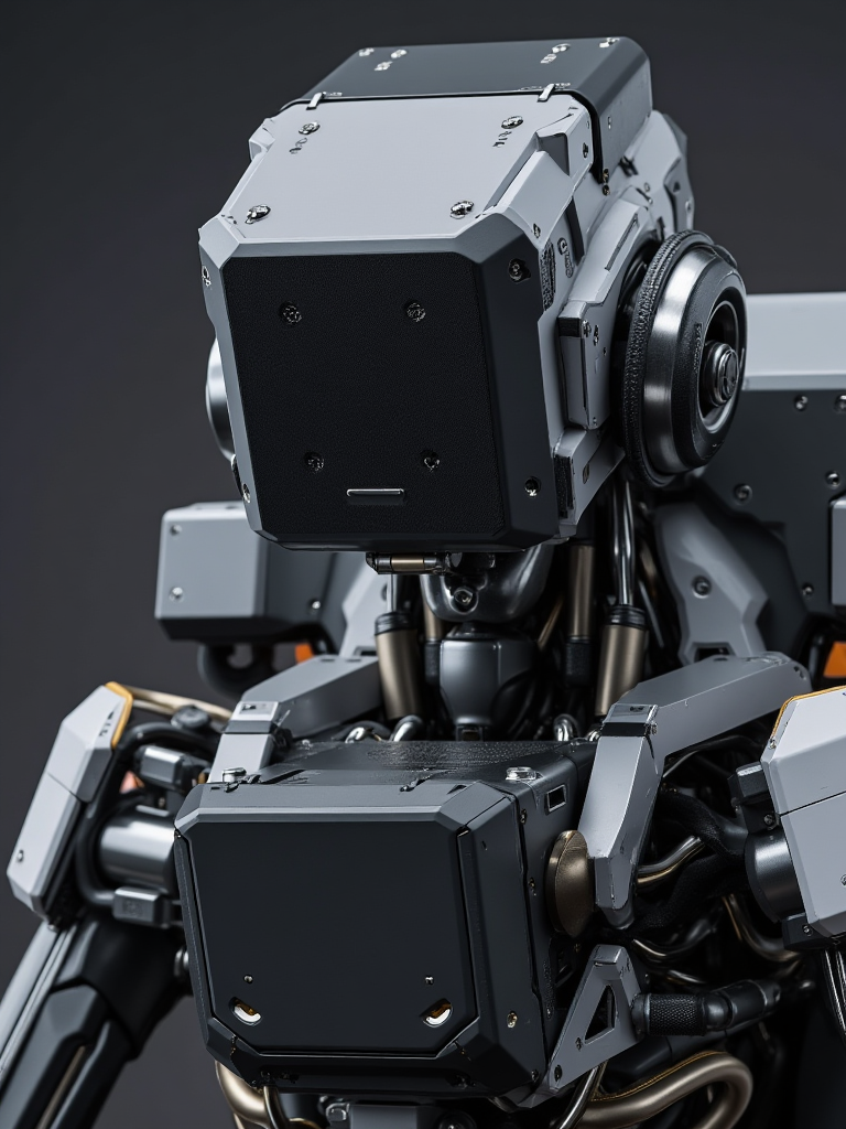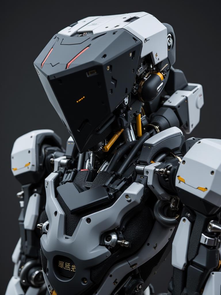 Exquisitely designed mech of boxy semi angular plaque, complex exposed machinery