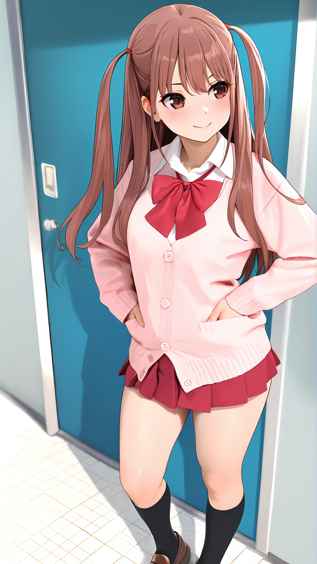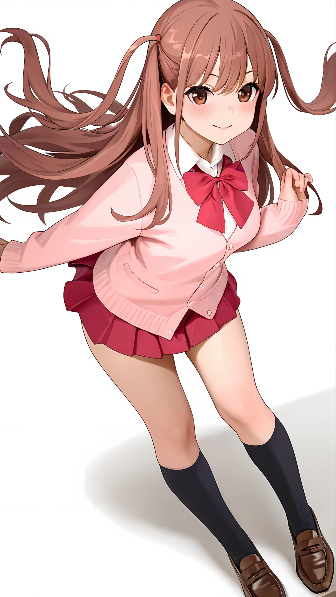 Atarashiako,1girl,solo,skirt,school uniform,cardigan,long hair,brown hair,socks,two side up,loafers,shoes,smile,black socks,pleated skirt,kneehighs,miniskirt,bow,brown eyes,red skirt,shirt,white shirt
