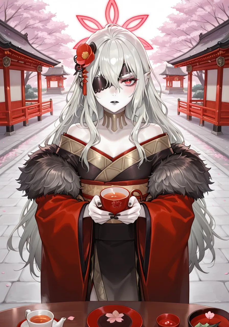 Trigger Words: EmblaFE1, grey hair, long hair, eyepatch, red eyes, halo, pale skin, pointy ears, black lips