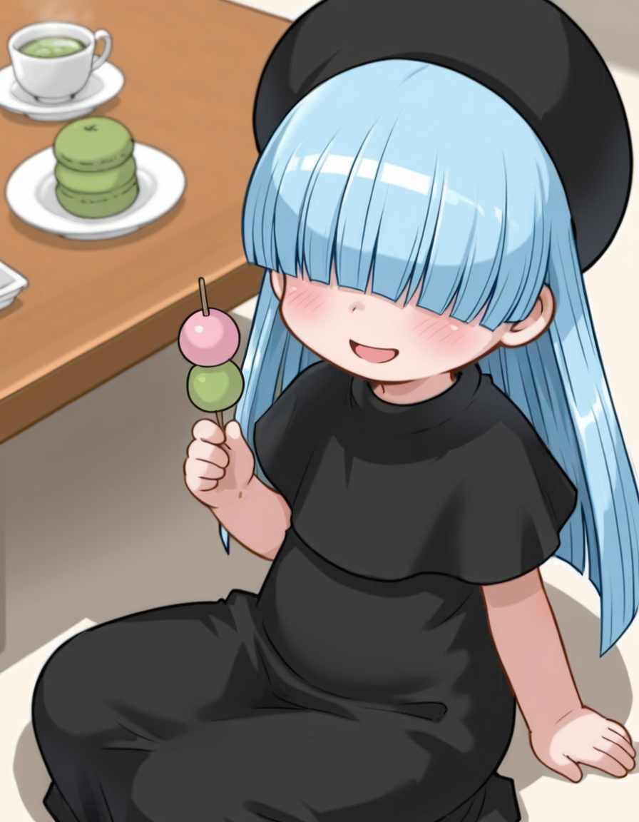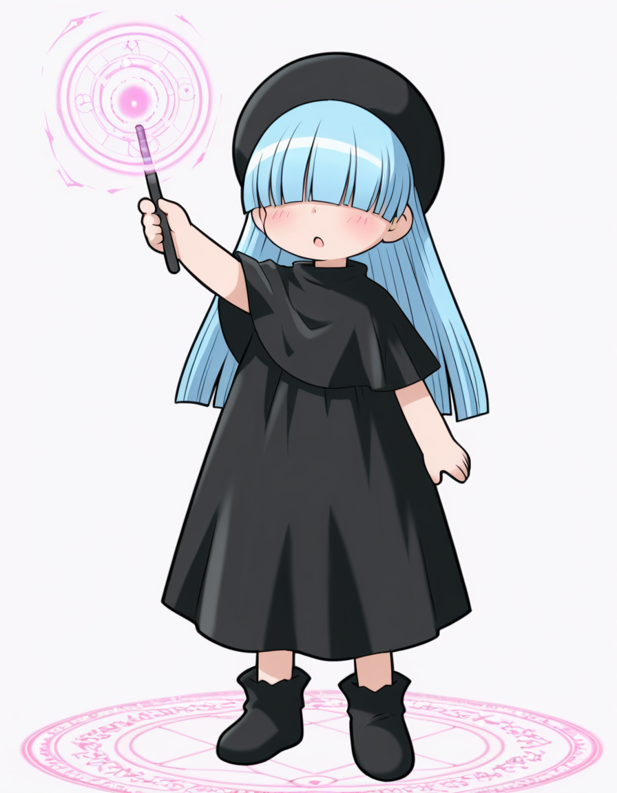 macaron, 1girl, hair over eyes, blue hair, long hair, hat, blush,black dress,long dress, ankle boots, blunt bangs, capelet, child