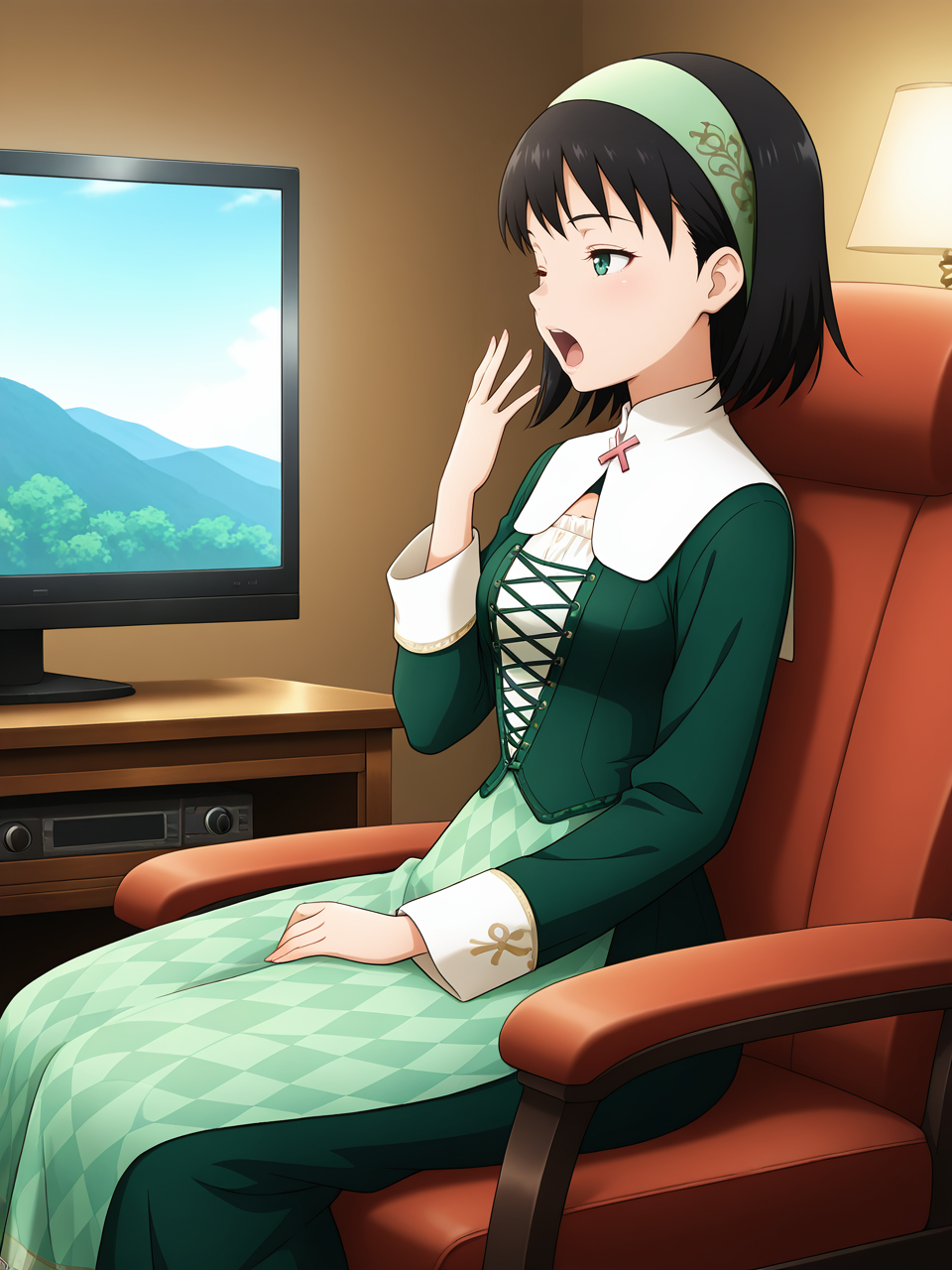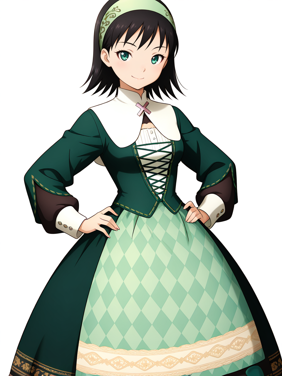 holvdia, black hair, hairband, green eyes, short hair, green hairband