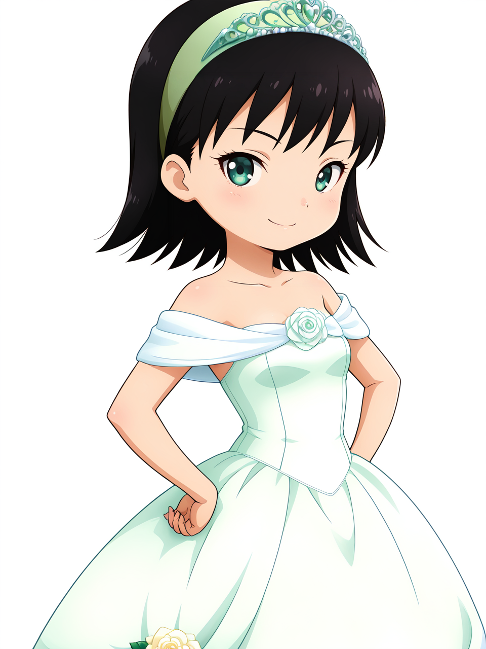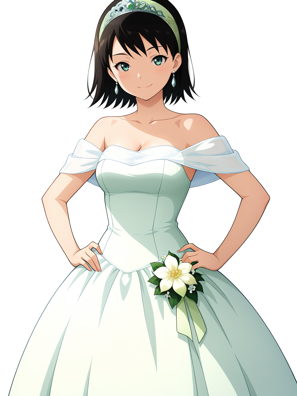 wedding dress, green dress, off-shoulder dress, tiara, bare shoulders, flower,