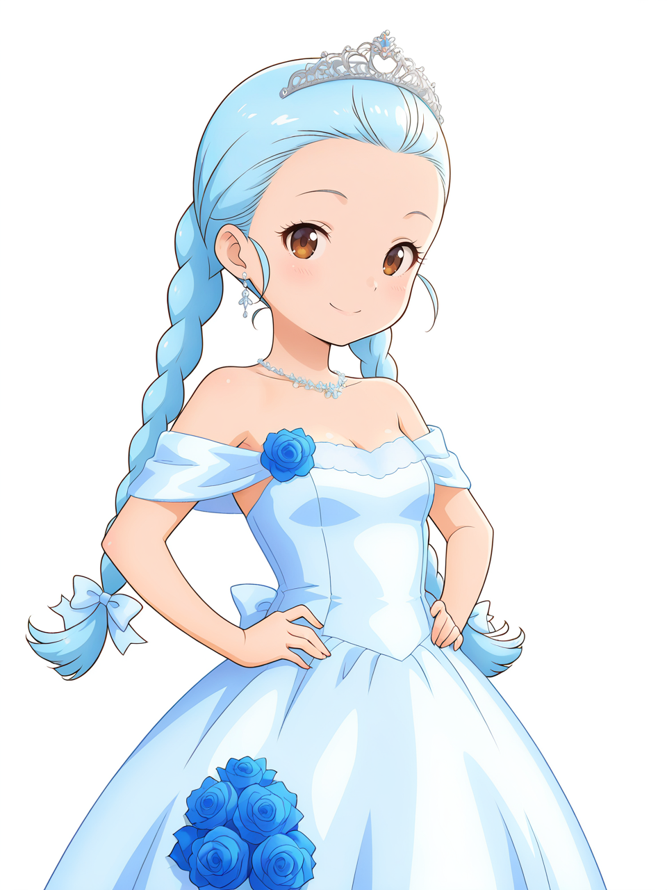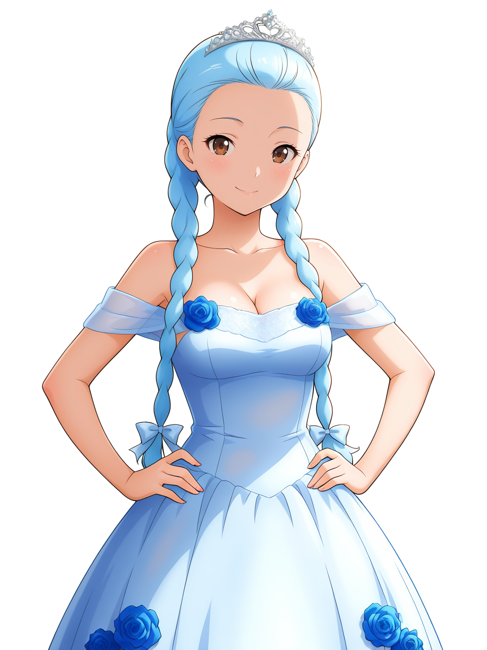 wedding dress, blue dress, off-shoulder dress, tiara, bare shoulders, flower,