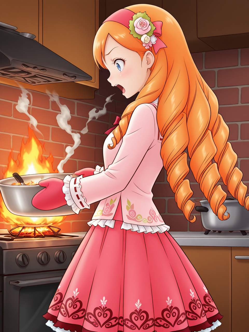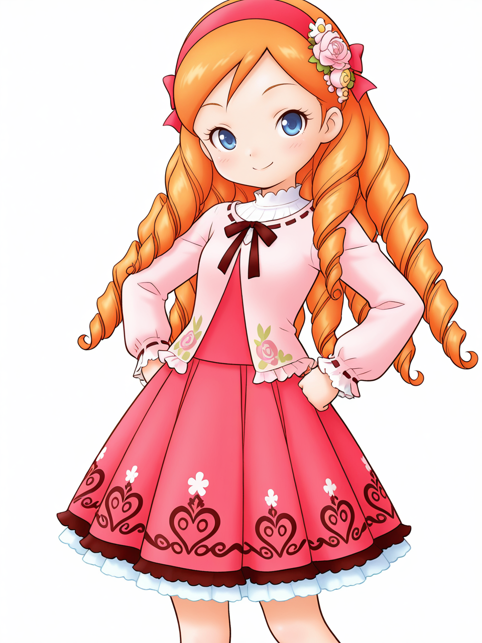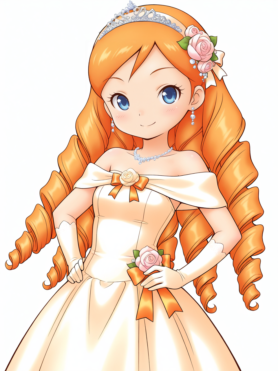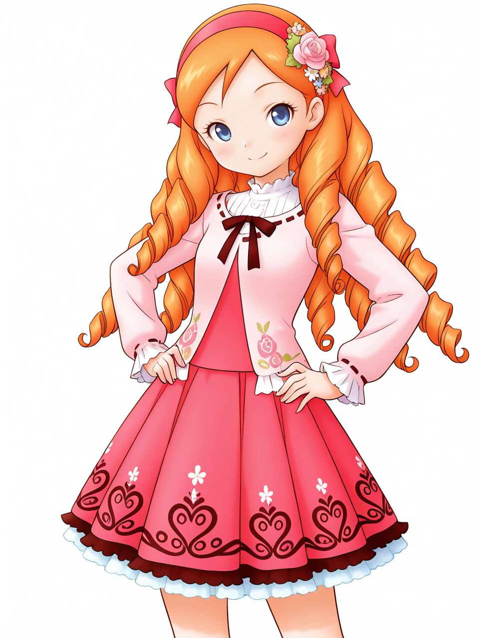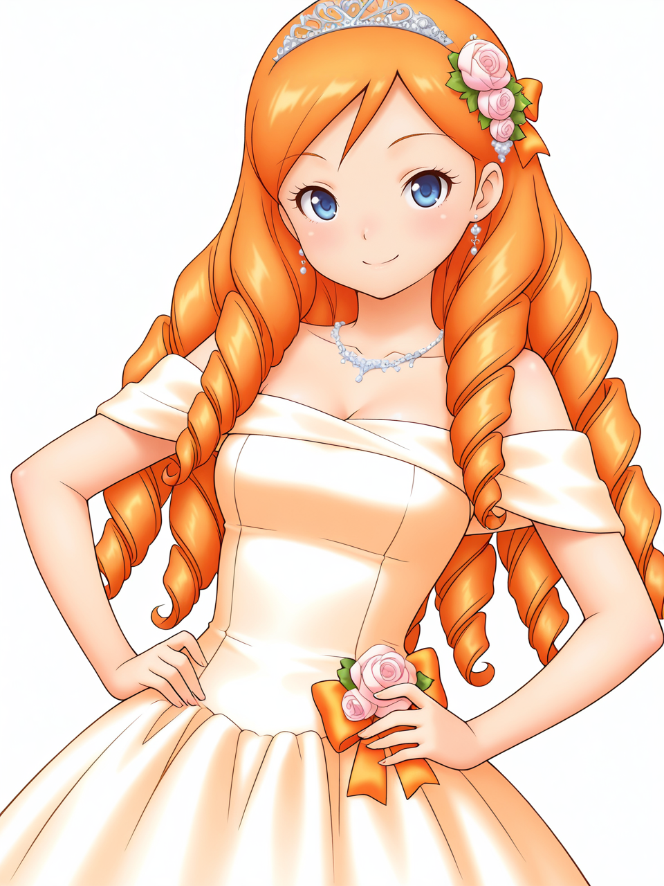 holvkatie, long hair, orange hair, drill hair, blue eyes, hairband, hair ornament, flower, hair flower,