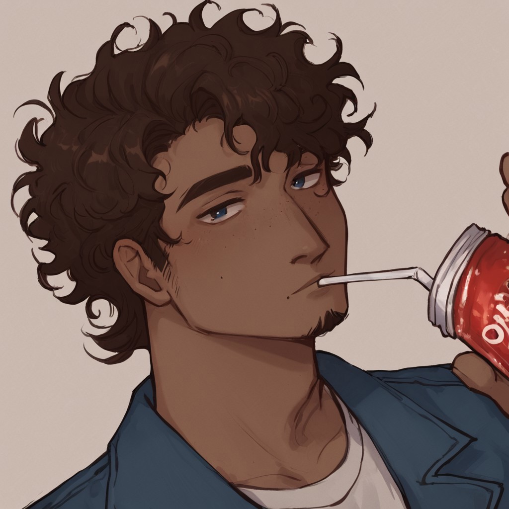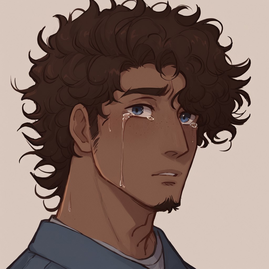 MichaelFNAF, dark hair, fluffy hair, mullet, dark skin, dark blue eyes, youthful face, facial hair, male