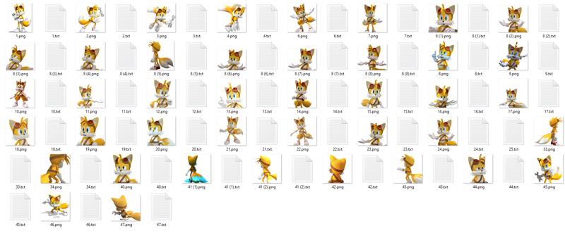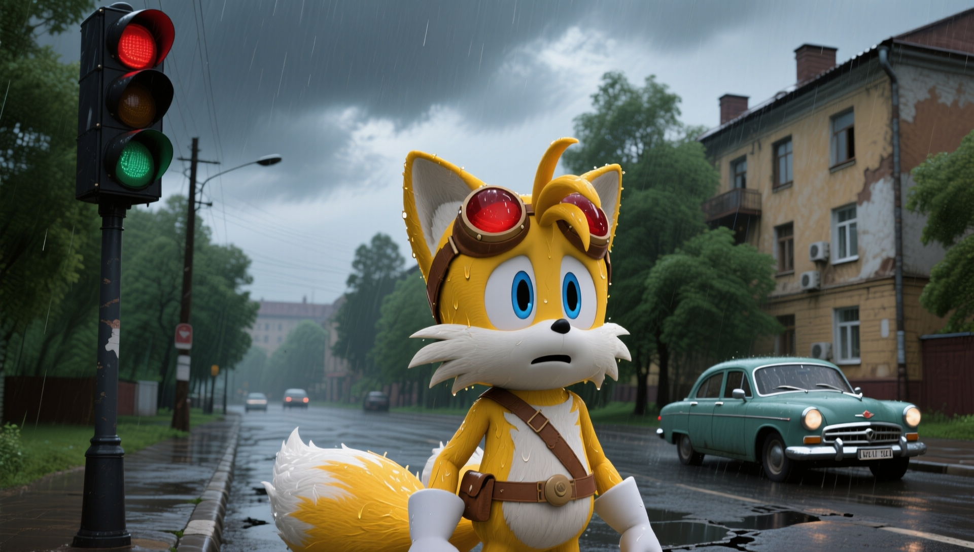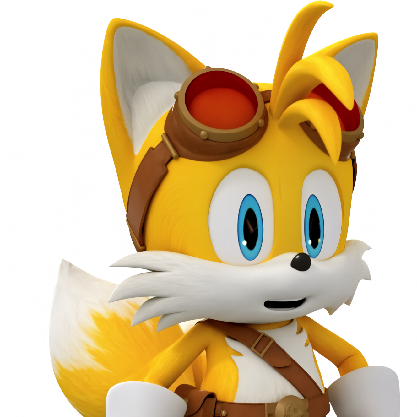 Tails is a yellow fox with big blue eyes and a small black nose. His muzzle is white with whiskers. He is wearing a brown leather harness and a pair of goggles on his head. His fur is white and fluffy and he has a smile on his face. His arms are stretched out to the sides and his hands are raised in a welcoming gesture.