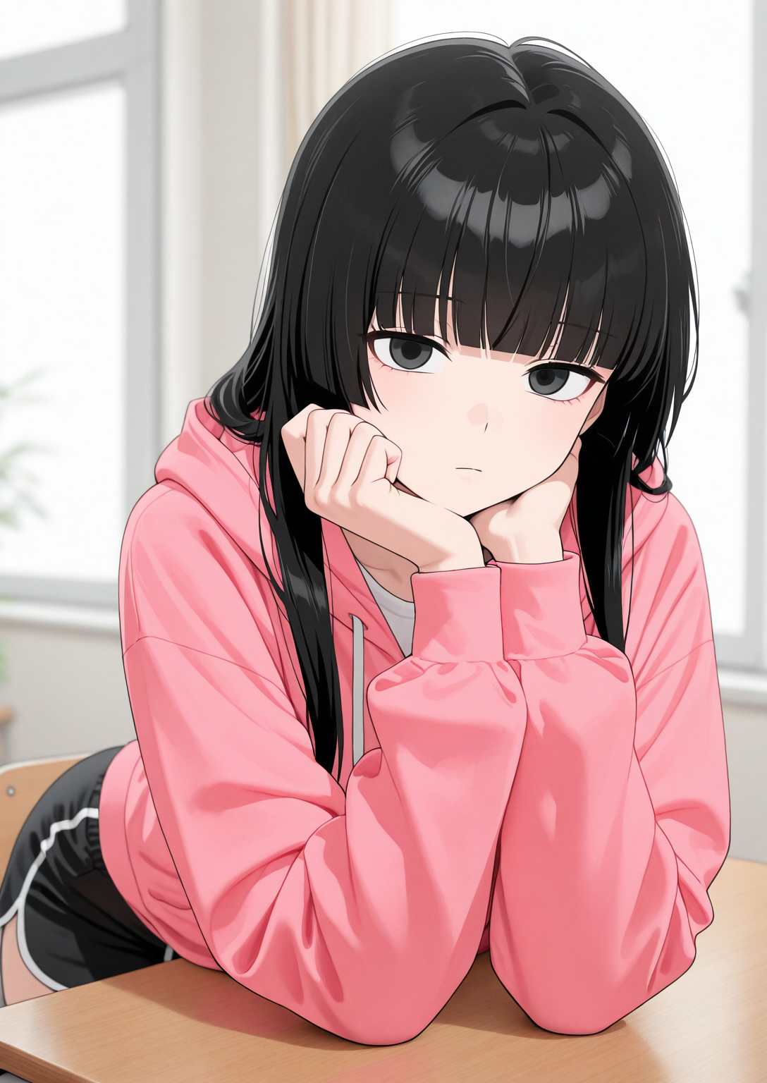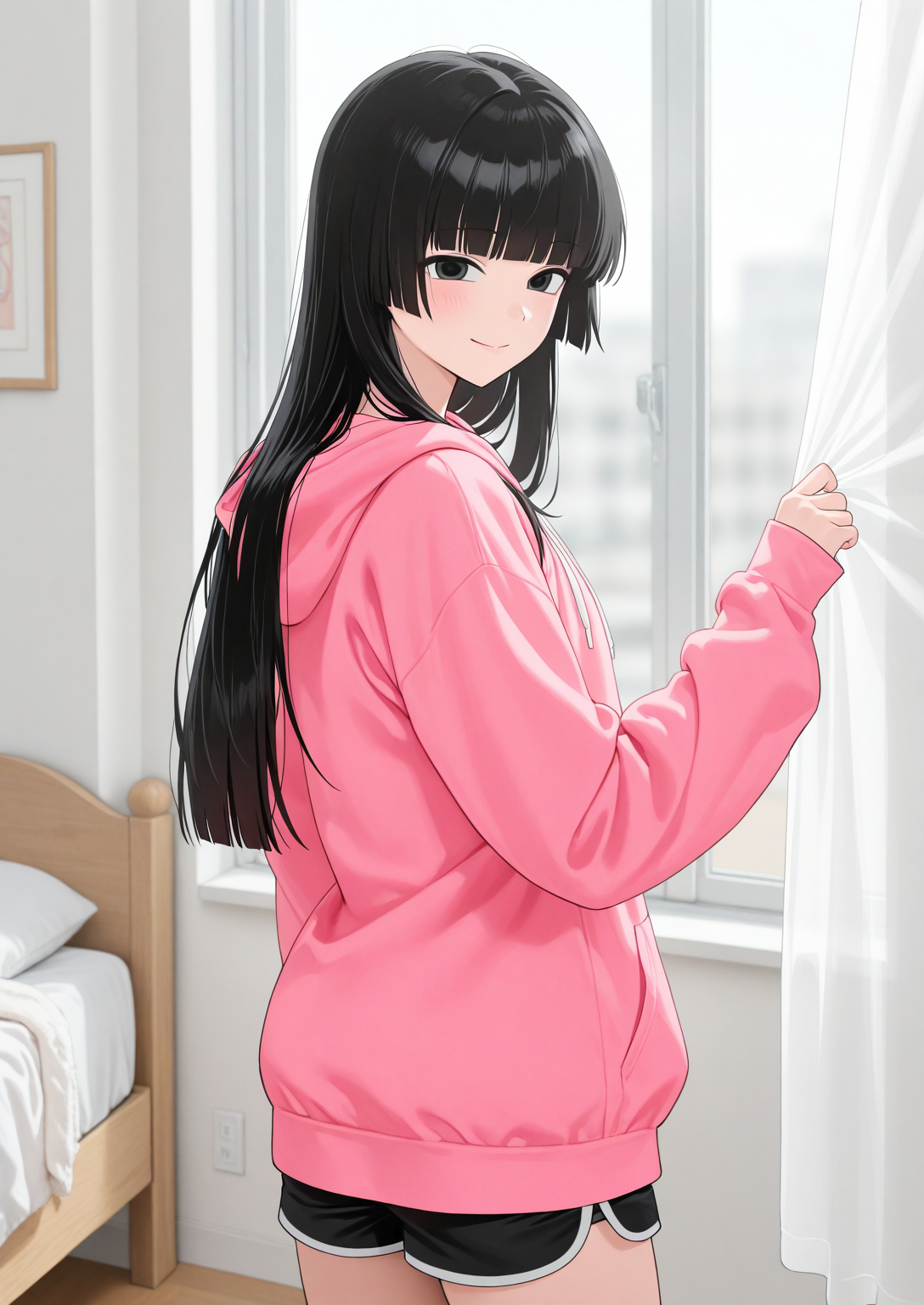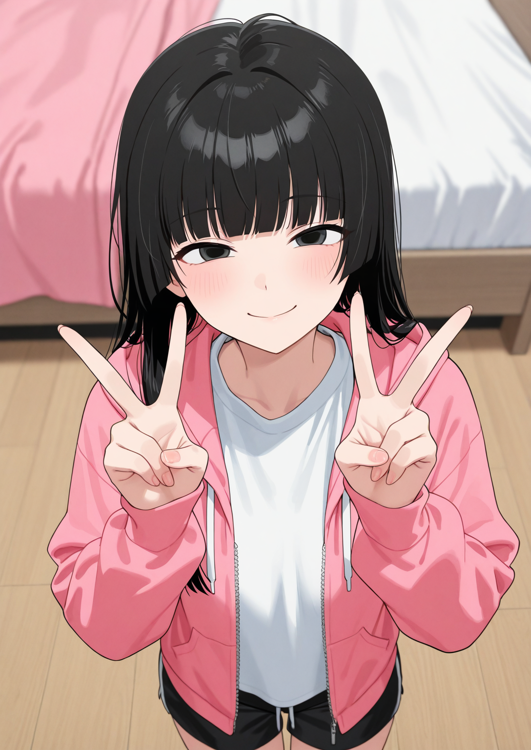 Oh Min-ji, black hair, black eyes, long hair, bangs, black eyes, white shirt, purple hoodie, black shorts,