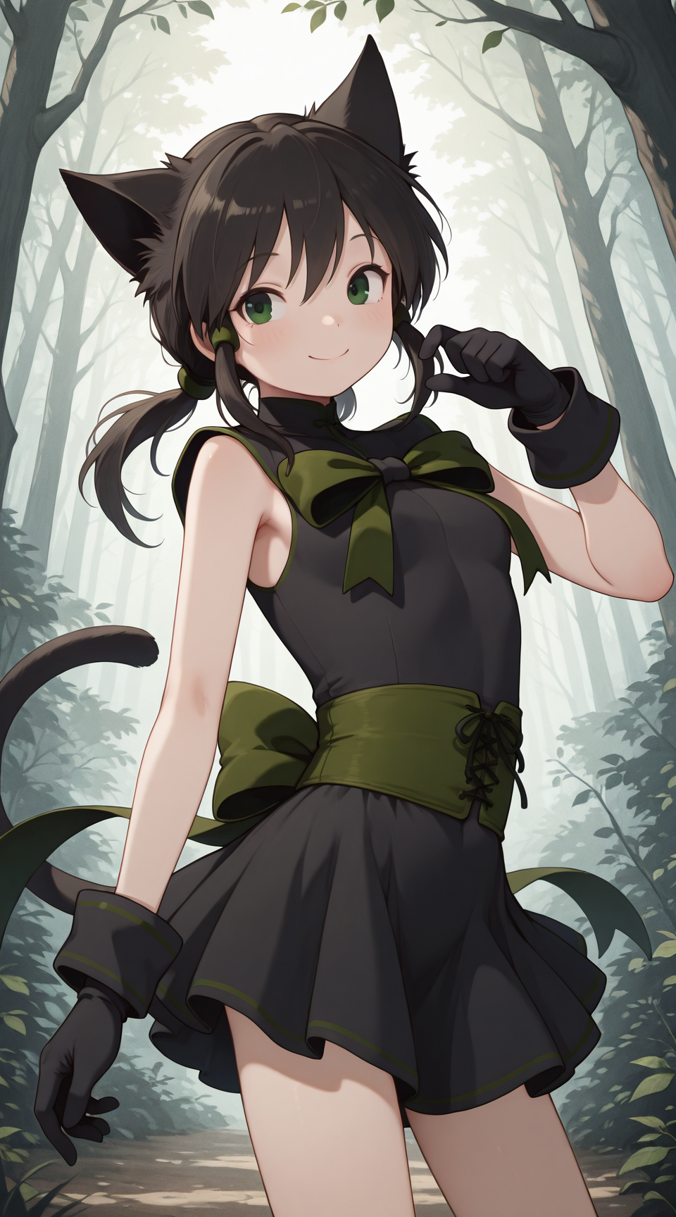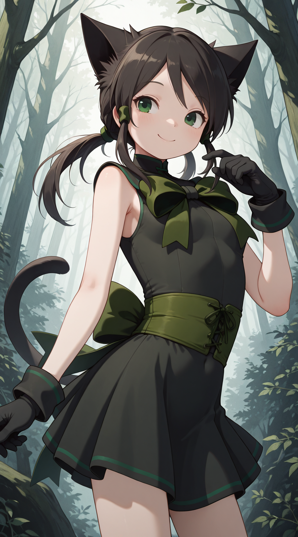 Prompt for standard outfit: rose_(riviera), black_gloves, green_bow, sleeveless_black_dress, tail, green_sash, green_trim