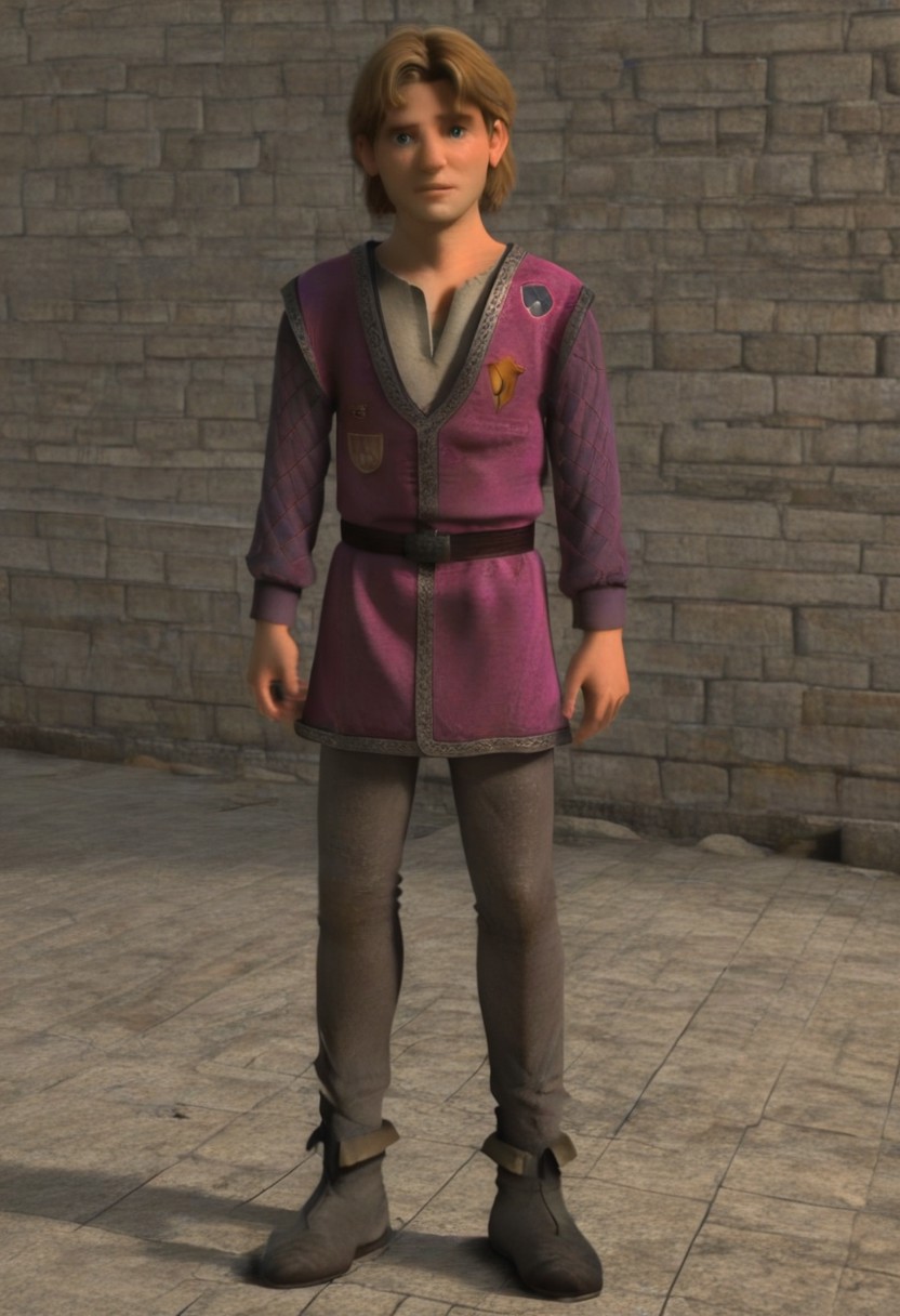 Artie, blonde-brown hair, split bangs, blue eyes, medieval outfit, fuschia-purple tunic, long sleeves, grayish-white undershirt, belt, gray pants, gray boots
