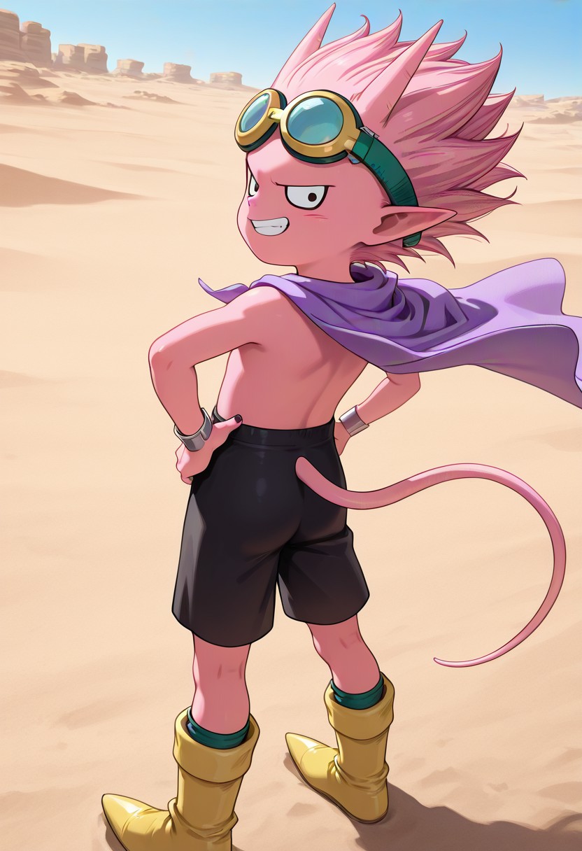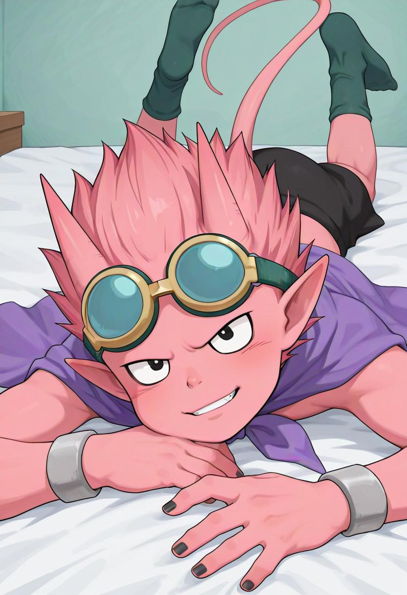 Beelzebub, Pink Skin, Pink Hair, Spiked Hair, Horns, Pointed Ears, Black Eyes, Black Fingernails, Tail