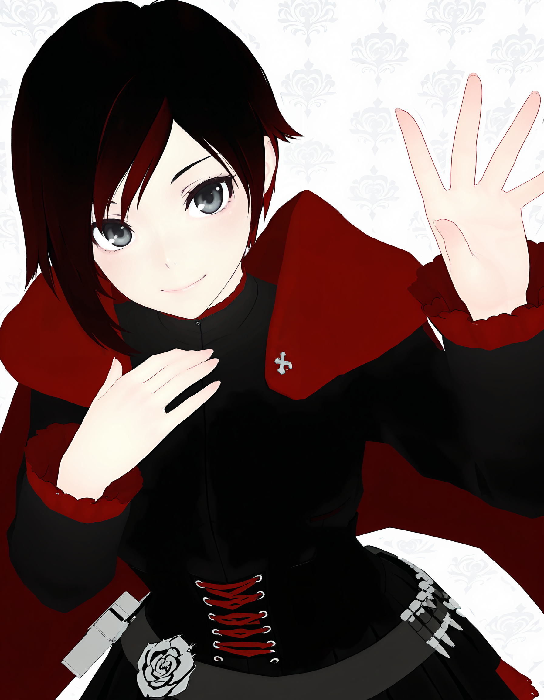<lora:RubyRose_V1:1>, RubyRoseV1, short hair, bangs, multicolored hair, black hair, red hair, silver eyes, grey eyes, pale skin,
