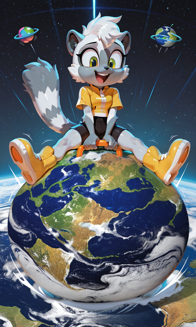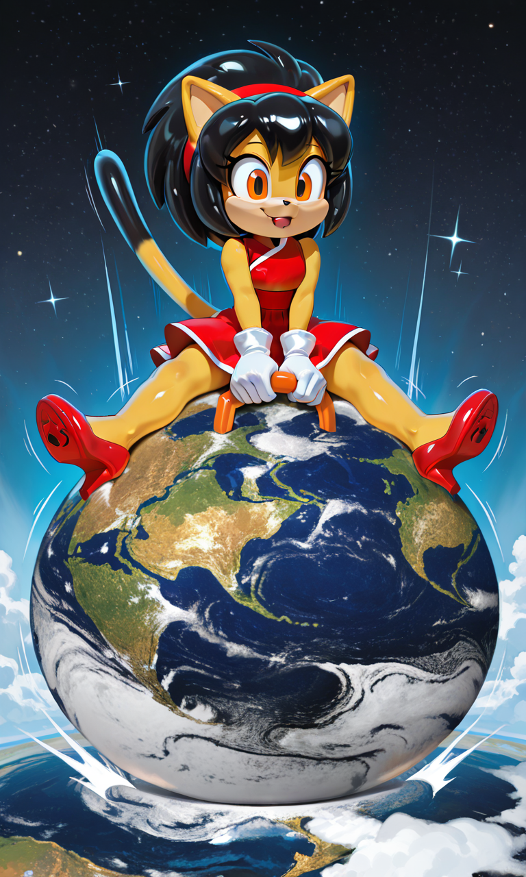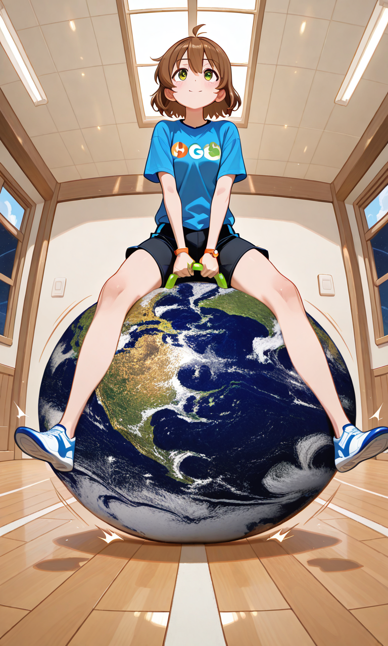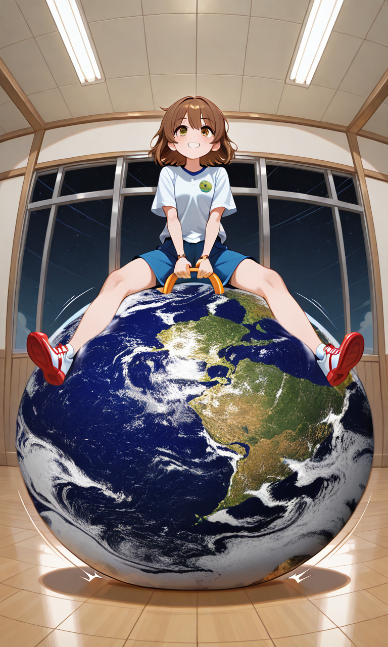 big hopper ball, big earth (planet), ride big hopper ball, big inflatable ball, hopper ball handle, grabbing hopper ball handle, handle between legs, sitting on big earth (planet), wide handle, legs apart, printed ball design