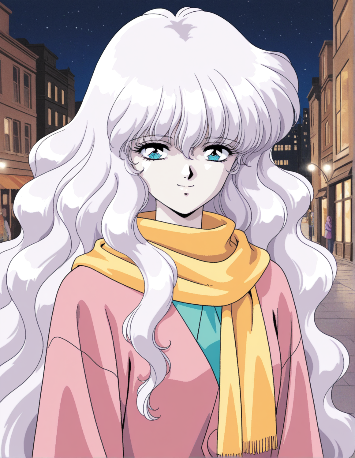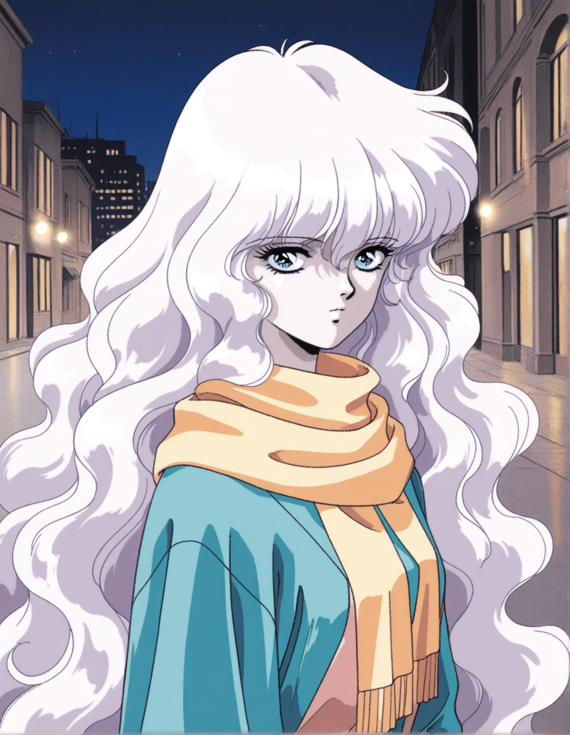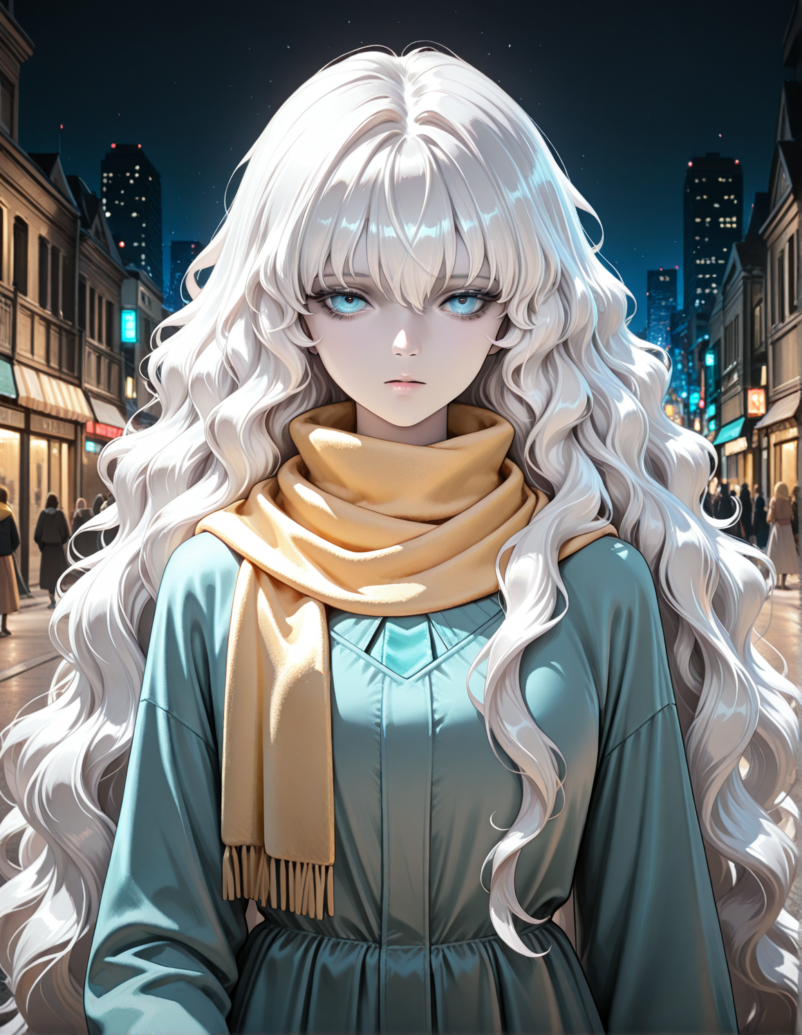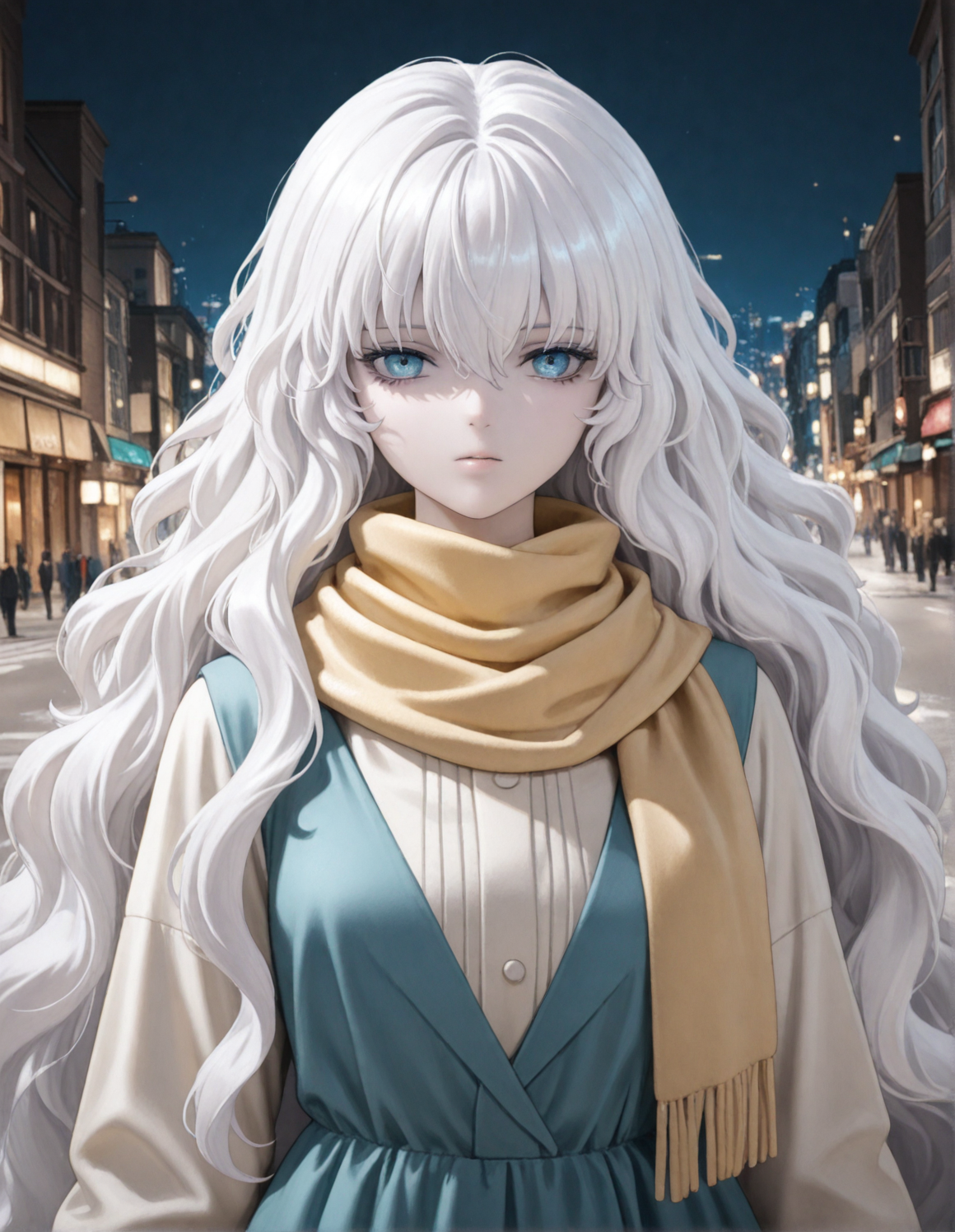 1girl, madoll, white hair, blue eyes, very long hair, wavy hair, pale skin, dress, long sleeves, yellow scarf,