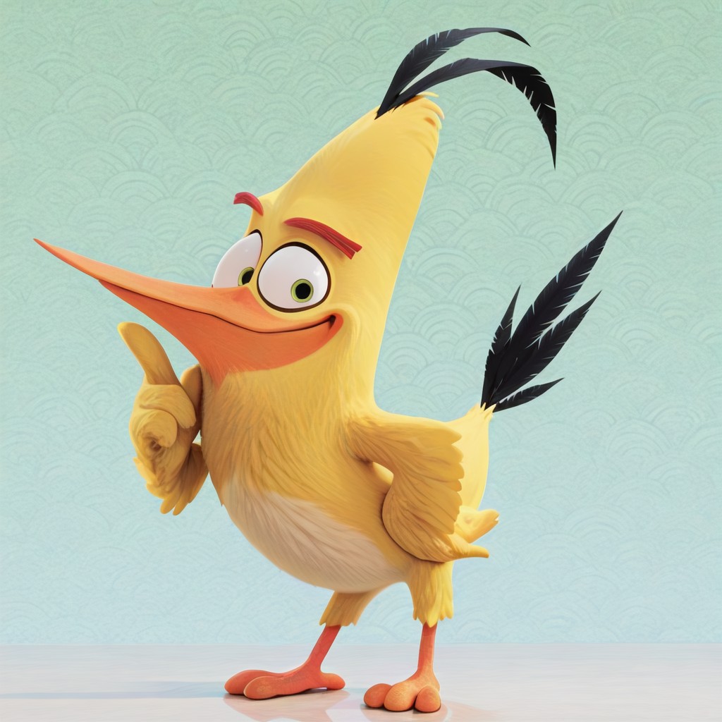 Chuck, bird, avian, yellow feathers, light yellow belly, Yellowish green eyes, red eyebrows, crest with Three Long black feathers, orange long beak, Orange avian Feet, black five feather tail,