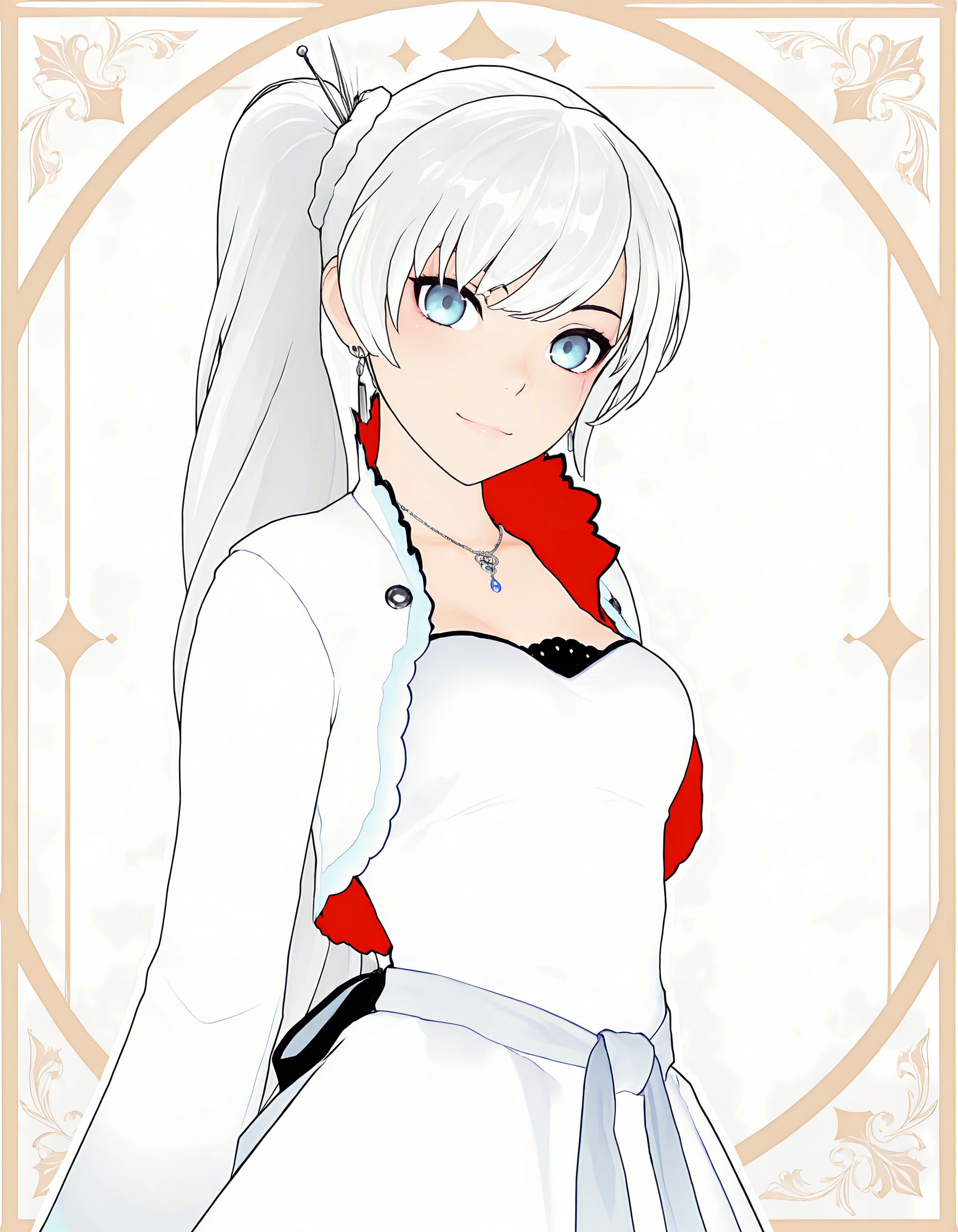 WeissSchneeV1, white hair, long hair, side ponytail,hair ornament, blue eyes, scar across eye, necklace, cropped jacket, long sleeves, white dress, white boots, high heel boots,