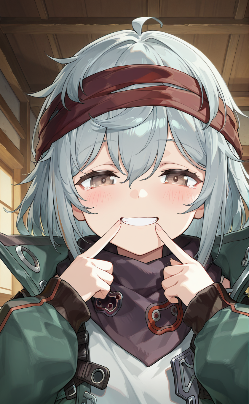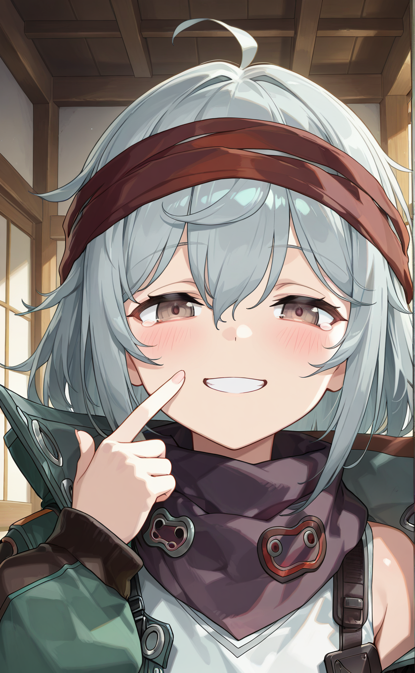 red headband,bandana,ahoge,short hair,grey hair,hair between eyes,brown eyes