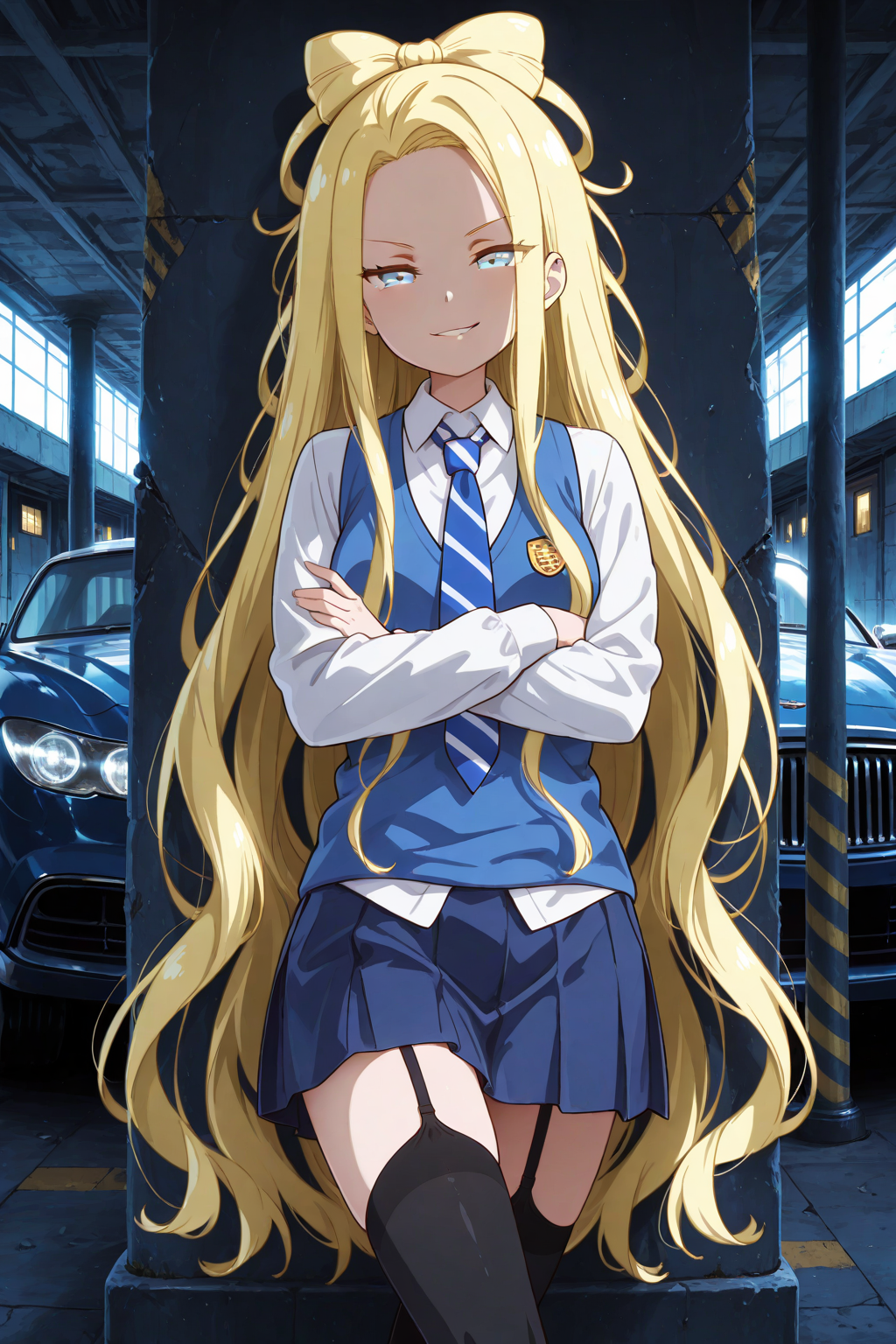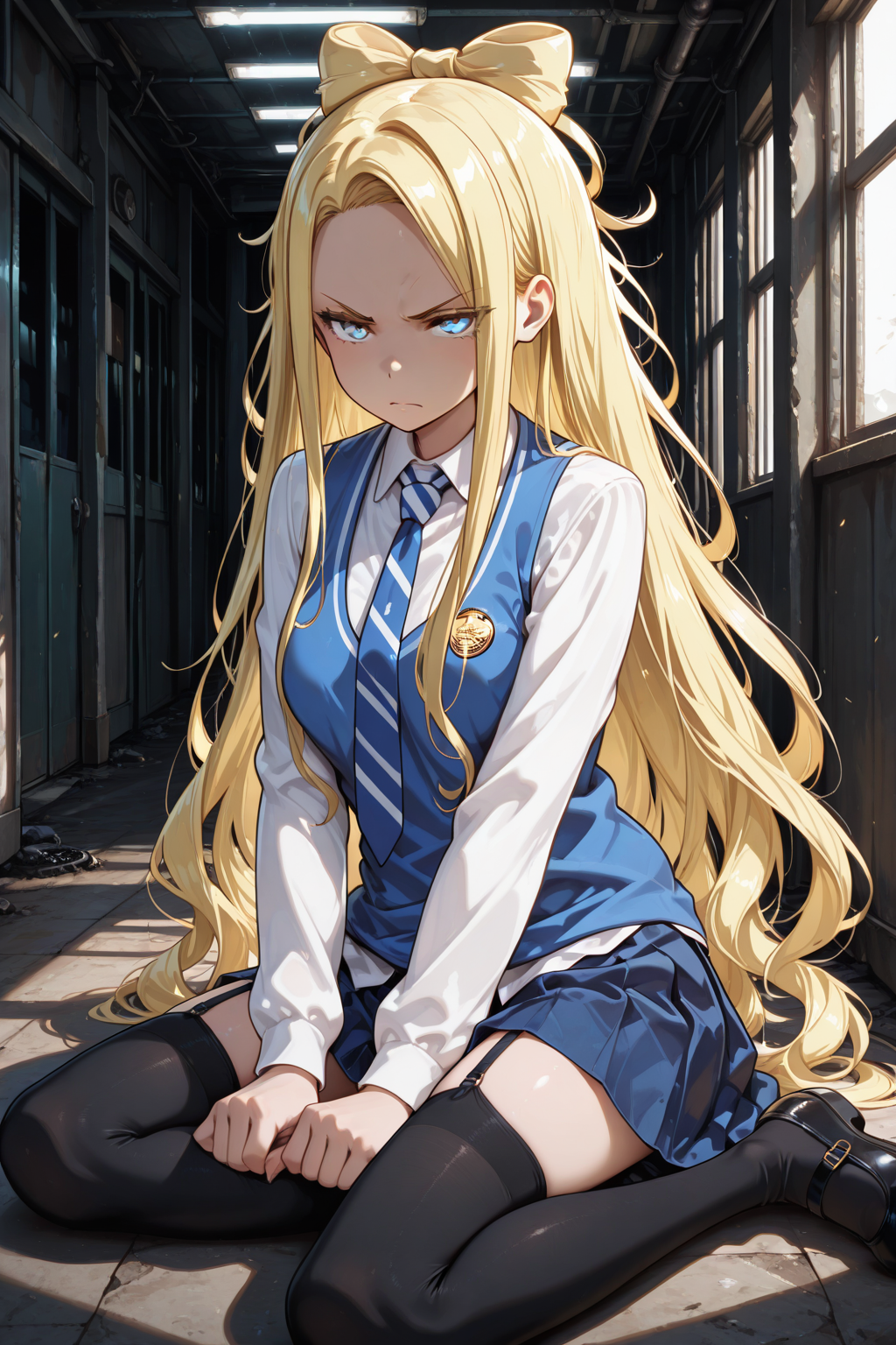 P_Arthur, blonde hair, very long hair, bow-shaped hair, blue eyes, school uniform, white shirt, collared shirt, striped necktie, blue vest, long sleeves, untucked shirt, blue skirt, pleated skirt, zettai ryouiki, black garter straps, black thighhighs
