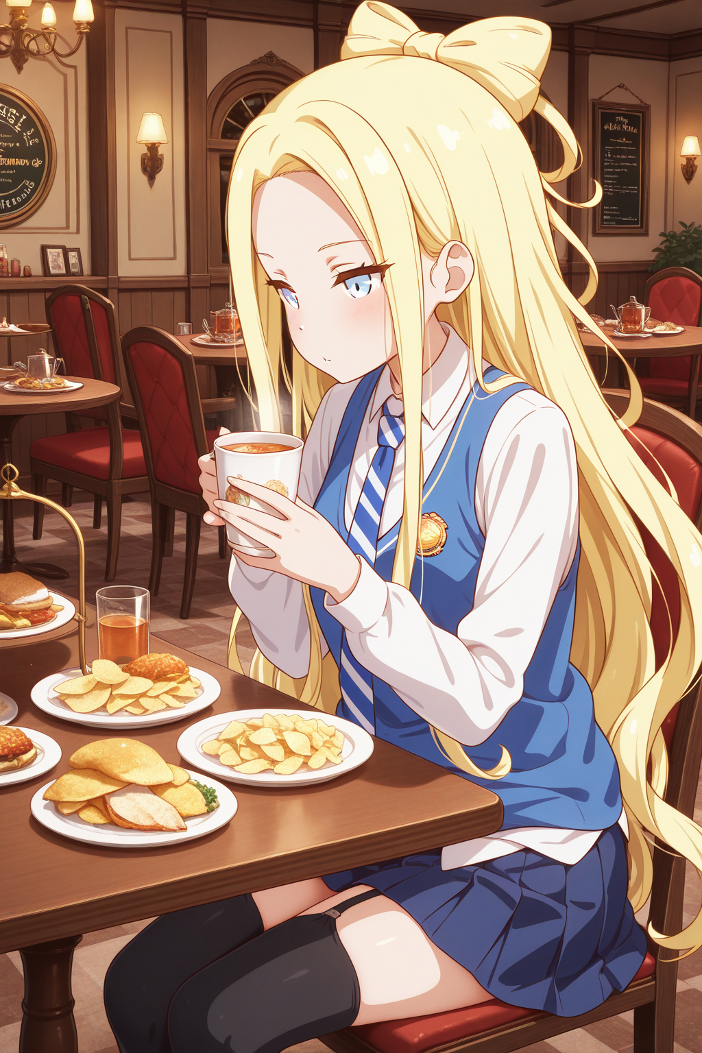 トリガーワード:P_Arthur, blonde hair, very long hair, bow-shaped hair, blue eyes, school uniform, white shirt, collared shirt, striped necktie, blue vest, long sleeves, untucked shirt, blue skirt, pleated skirt, zettai ryouiki, black garter straps, black thighhighs追加:black mary janes