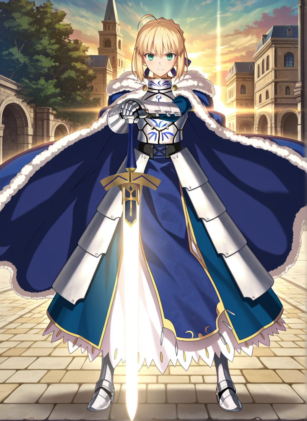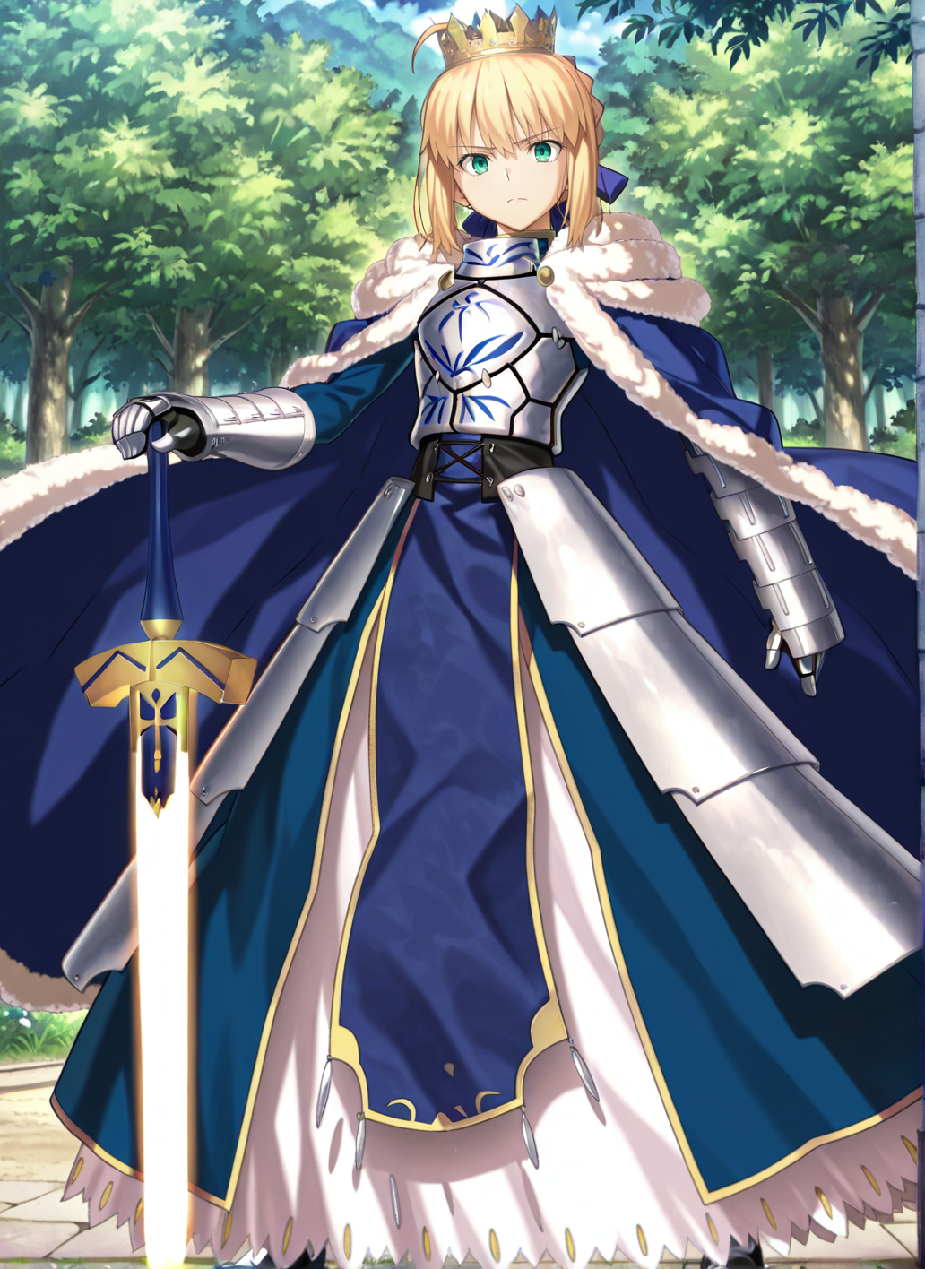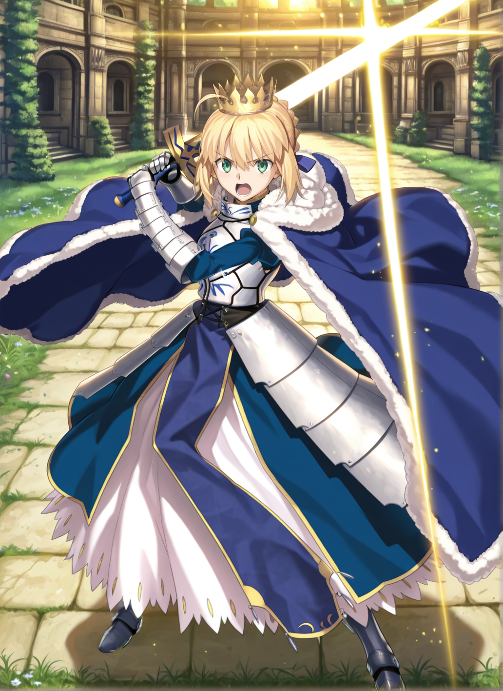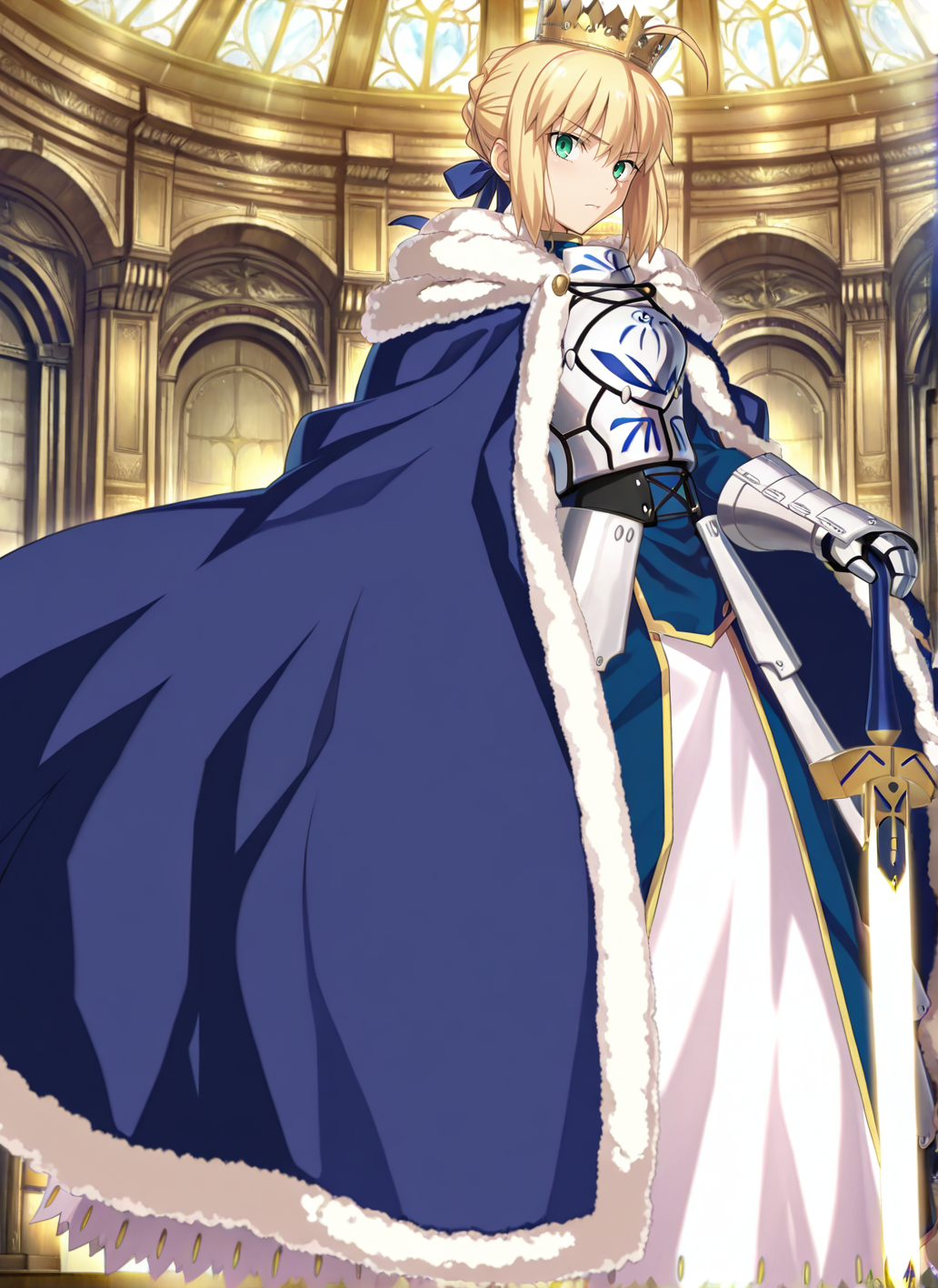 artoriapendragonfgo, 1girl, blonde hair, ahoge, dress, green eyes, breast plate, crown, cape