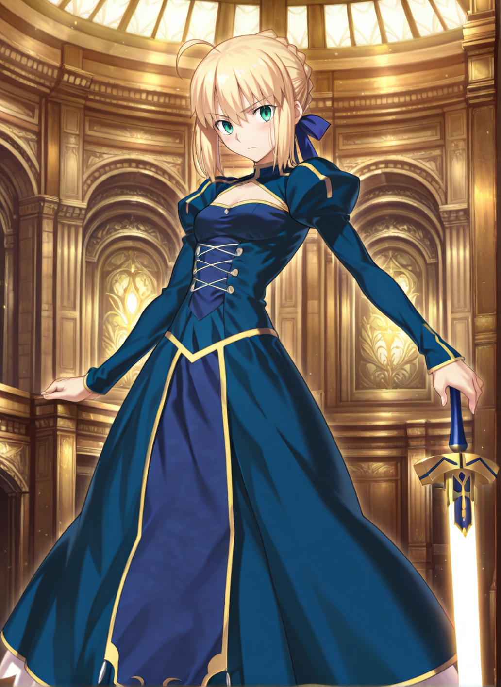 artoriapendragonfgo, 1girl, blonde hair, ahoge, dress, green eyes