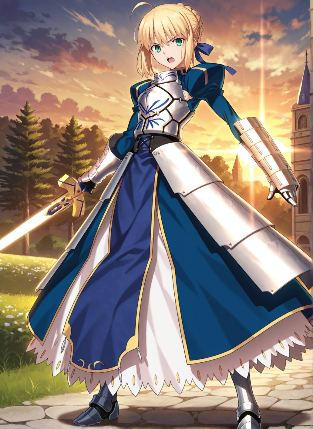 artoriapendragonfgo, 1girl, blonde hair, ahoge, green eyes, armor, dress, breast plate,