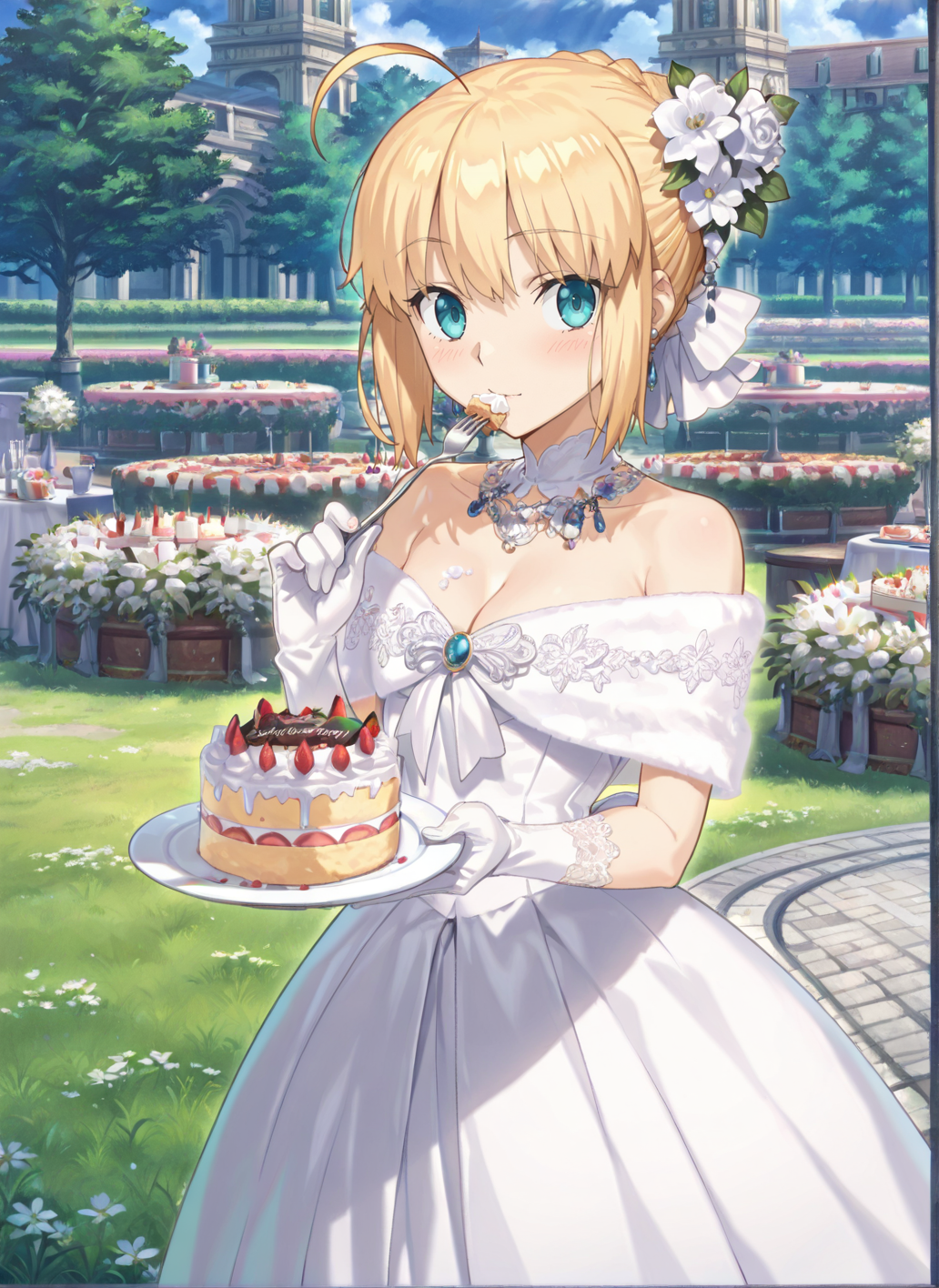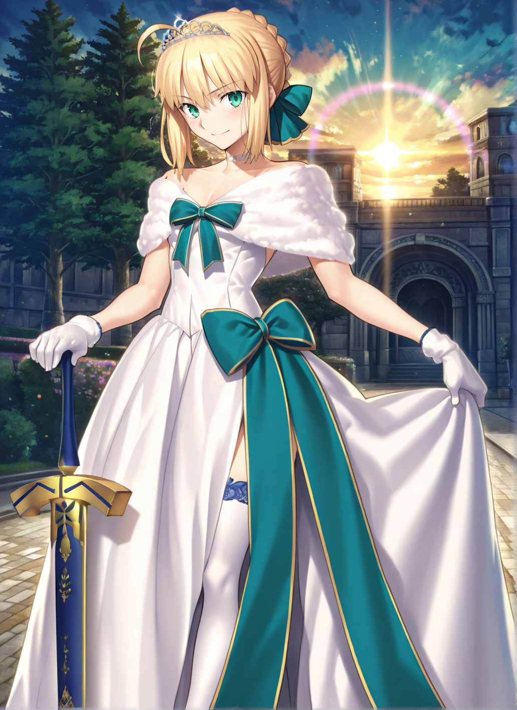 artoriapendragonfgo, 1girl, blonde hair, ahoge, green eyes, choker, bow, tiara, green ribbons, thighhighs, dress, gloves, white gloves, white dress, ahoge, white thighhighs, white footwear, high heels