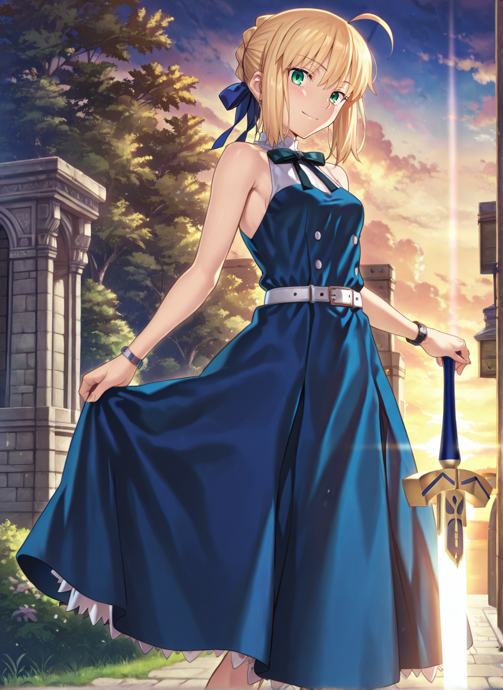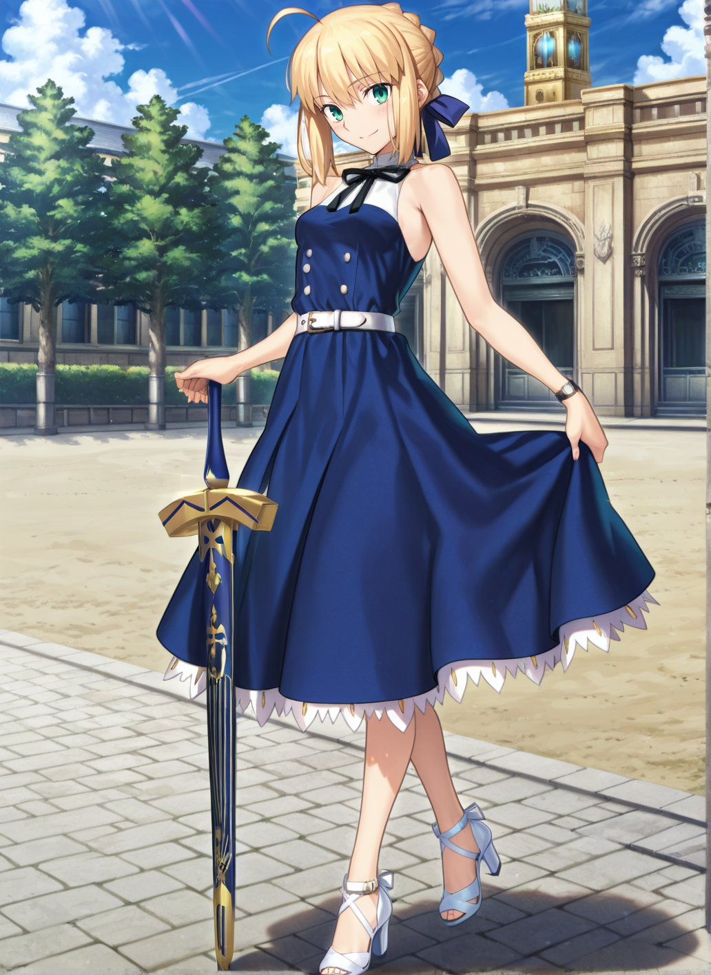 artoriapendragonfgo, 1girl, blonde hair, ahoge, green eyes, bare shoulders, hair ribbon, sleeveless dress, dress, blue dress, white belt, high heels, white footwear