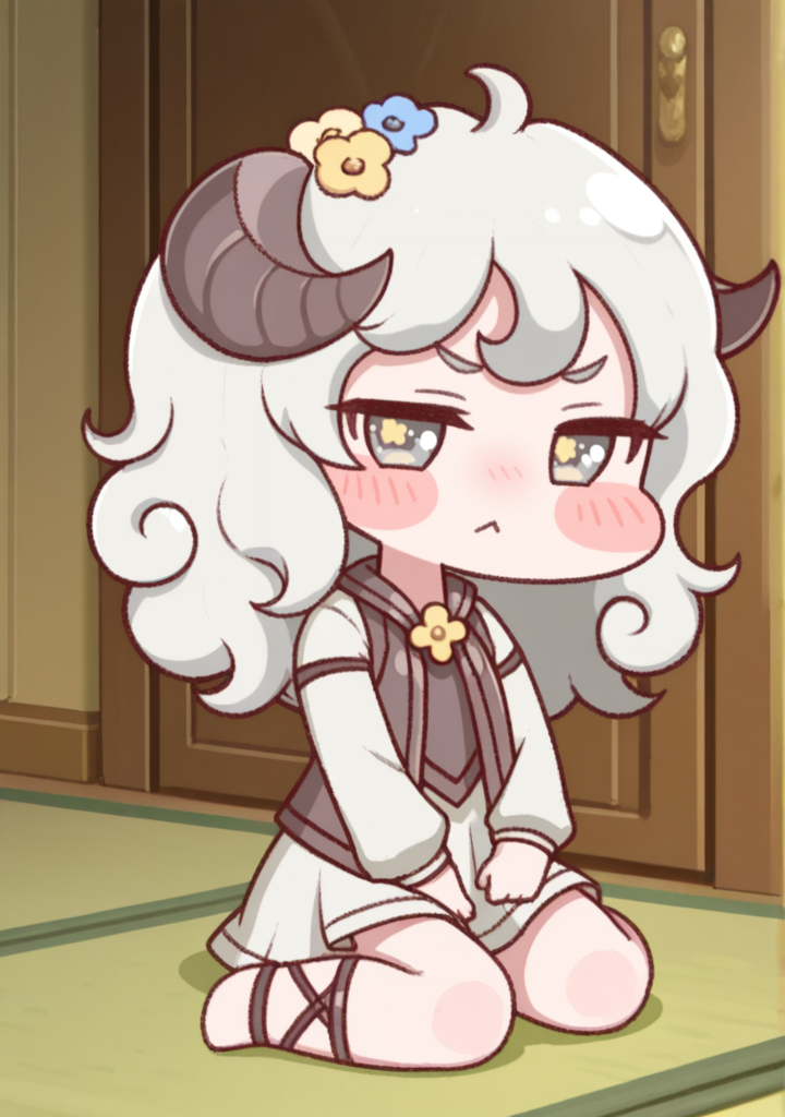 default:margot-def grey hair,white hair,grey eyes,animal,sheep girl,sheep ears,sheep horns,curled horns,long hair,curly hair,ahoge,dress,white dress,white skirt,long sleeves,vest,hair ornament,hair flower,blue flower,