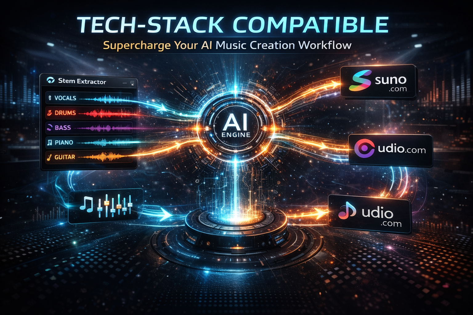Flexible export formats (WAV, FLAC, MP3) ensure your stems integrate seamlessly into any DAW — FL Studio, Ableton, Logic, Pro Tools, or AI-based music generators.