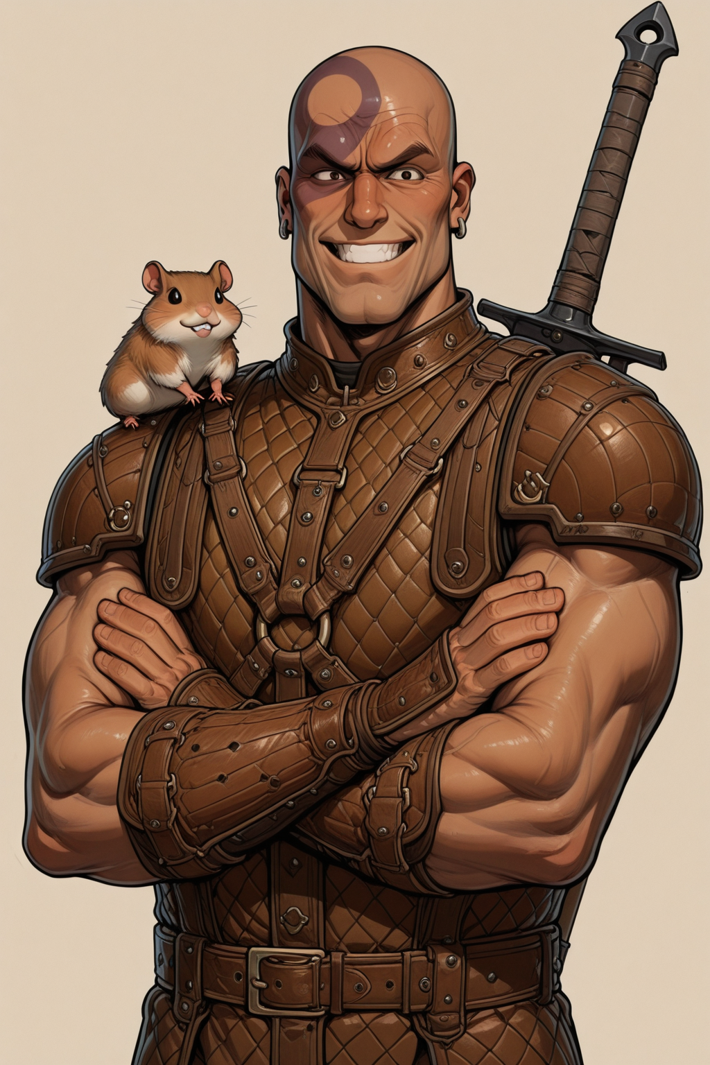 bgminsc, 1boy, male focus, muscular, bald, facial tattoo, manly, brown eyes, earrings, dark brown leather armor, pauldrons, harness, arm guards, pants, boots, weapon on back,Boo