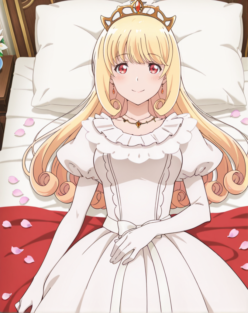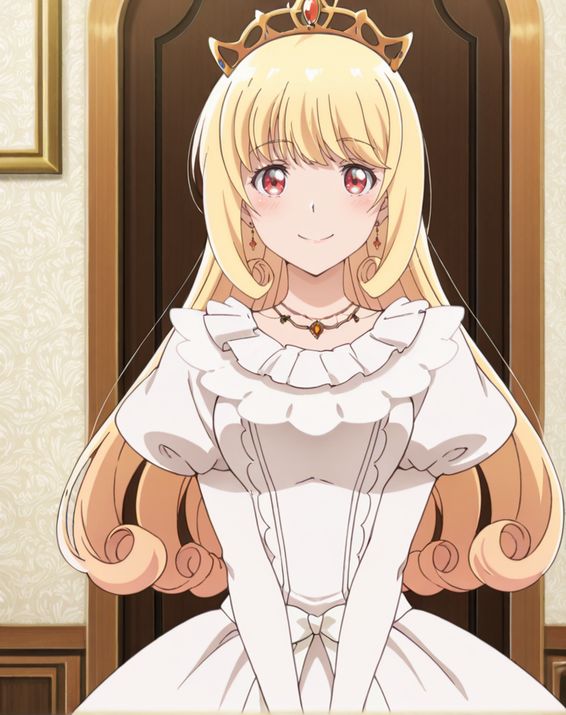 puffy sleeves, elbow gloves, white dress, white gloves, tiara, necklace
