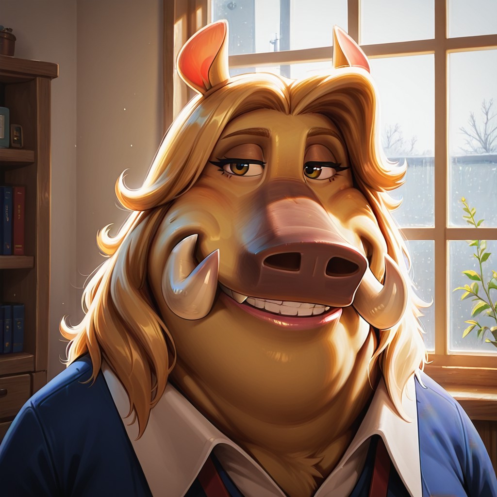 Flo(character), female, warthog, tusks, chubby, furry, anthro, blonde hair,