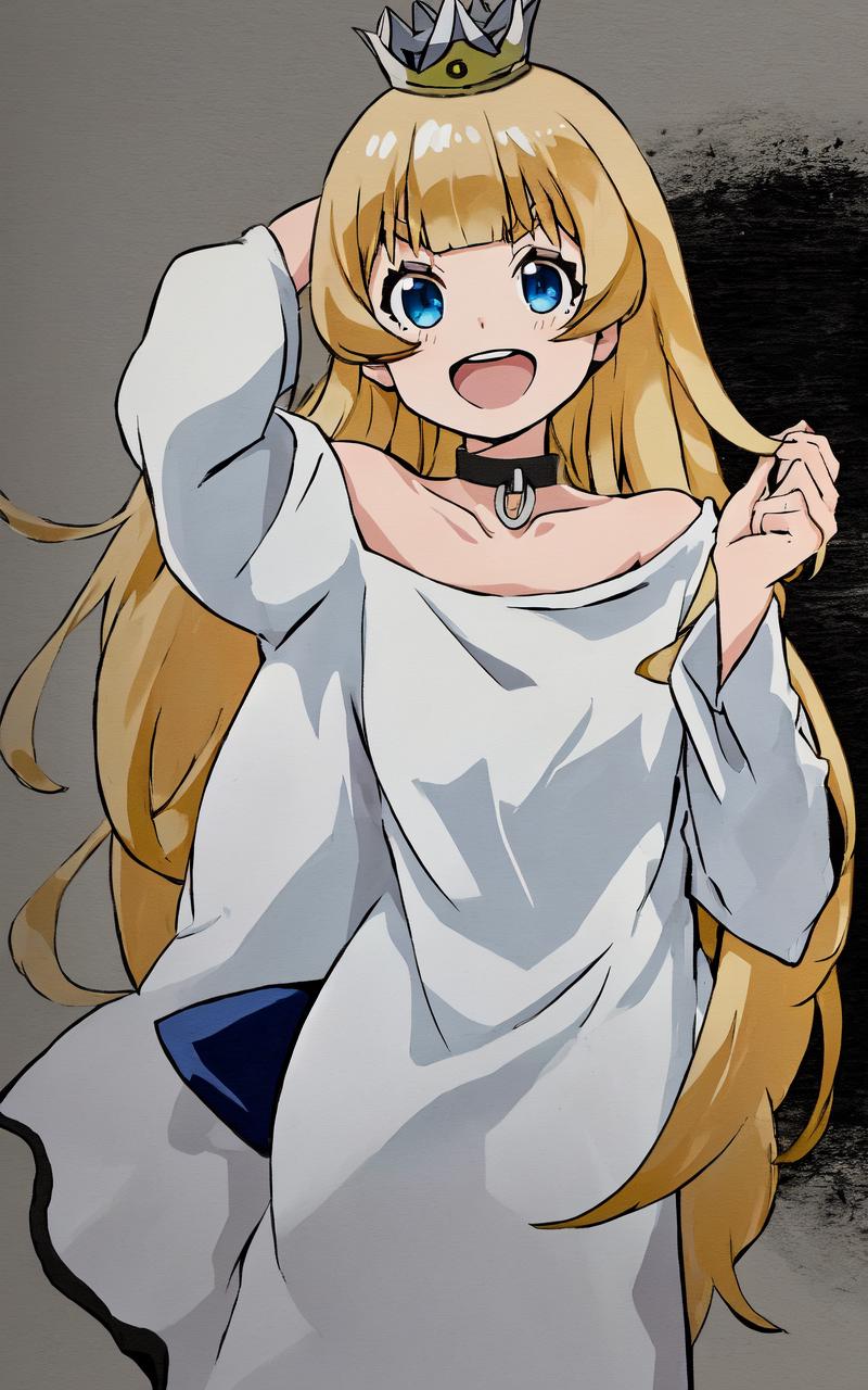 1girl <lora:gomon_hime:0.7> gomon-hime, princess, silver mini crown, flipped hair blonde hair long hair short sidelock shiny hair blunt bangs, blue eyes eyelashes thick eyebrows, toenails, white shirt off shoulder long sleeves oversized shirt long shirt wide sleeves, black collar, Overjoyed, extremely quality extremely detailed, illustration, cute anime face