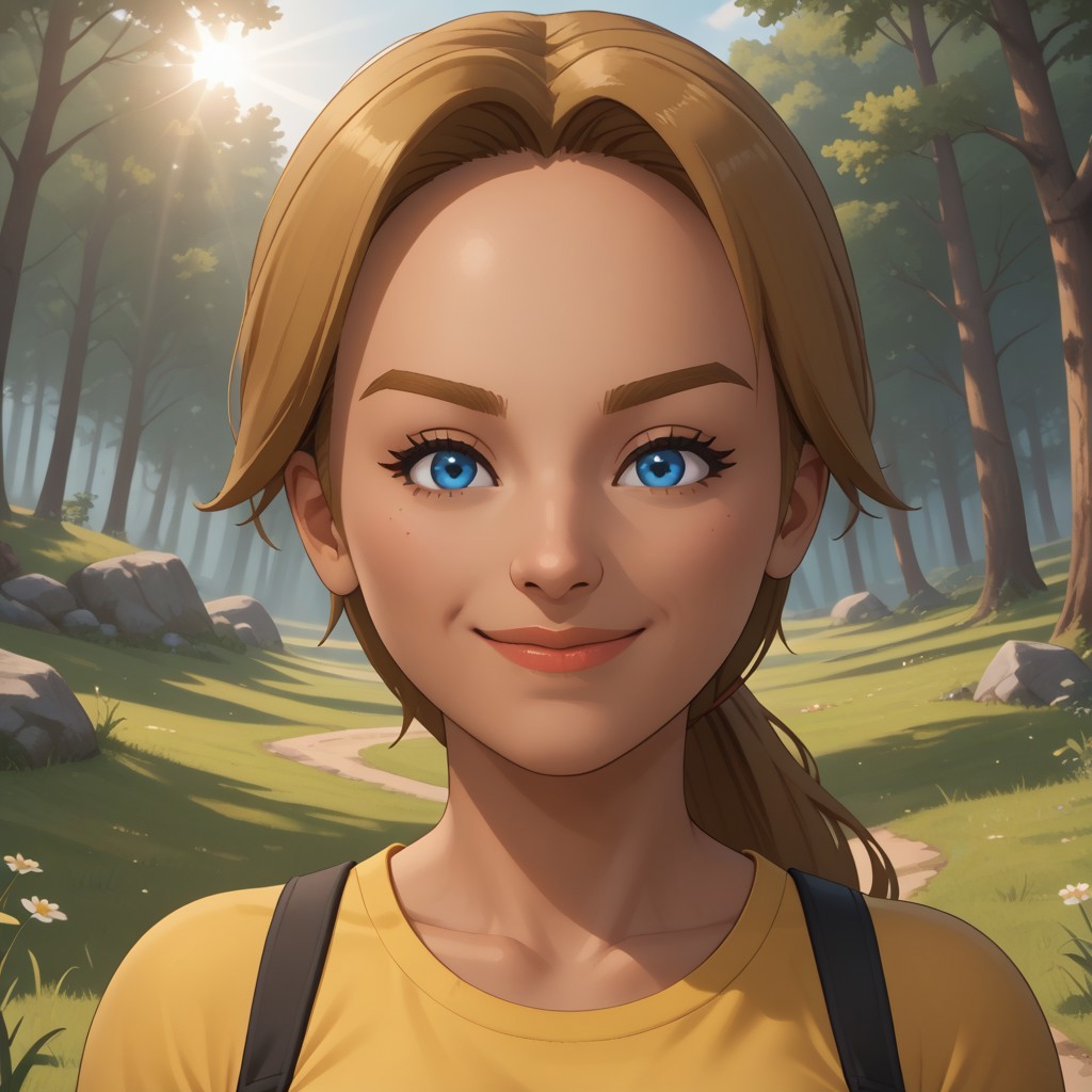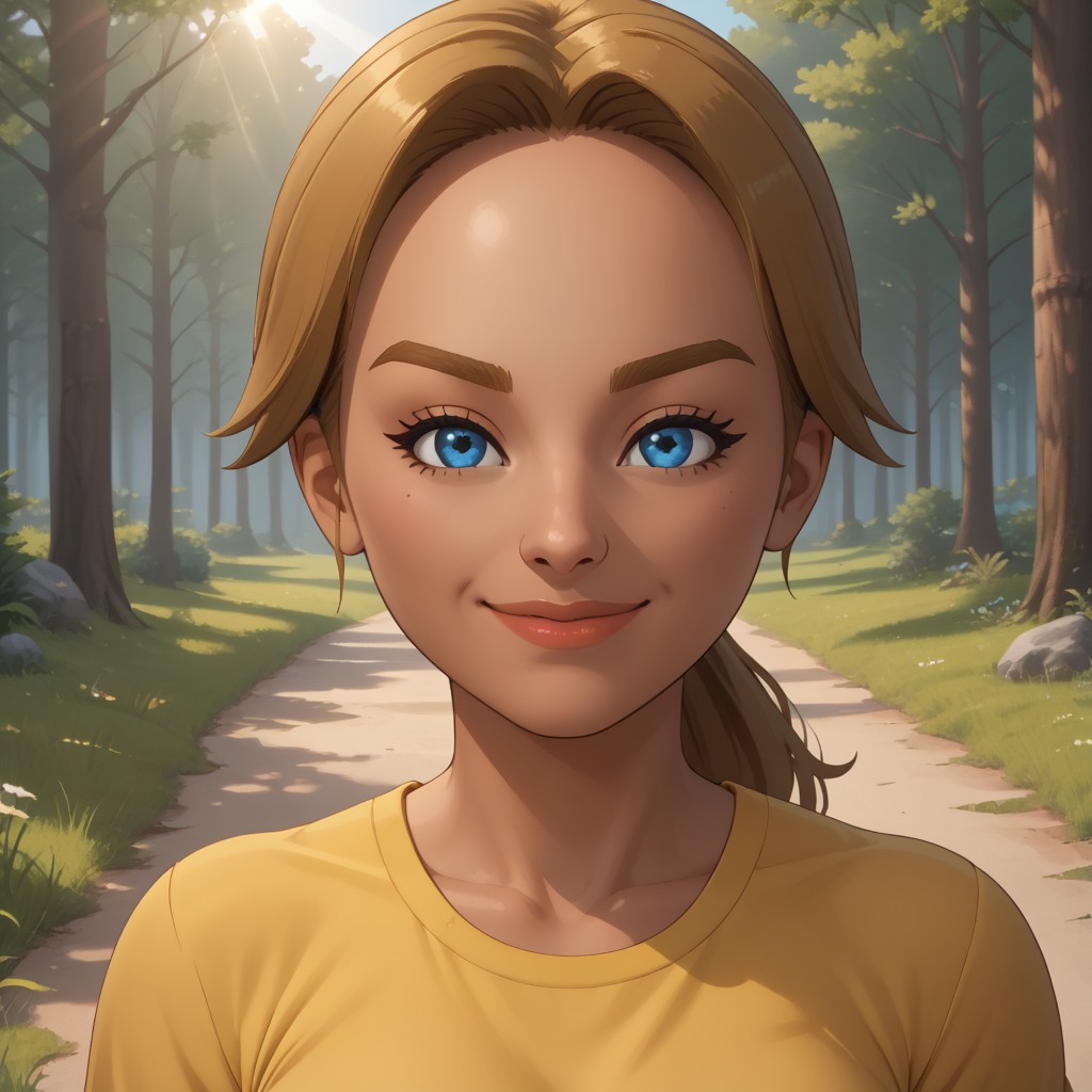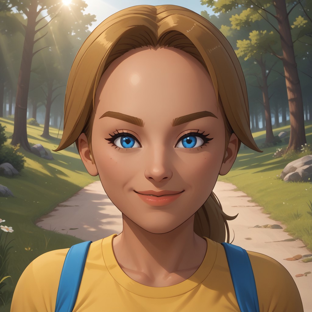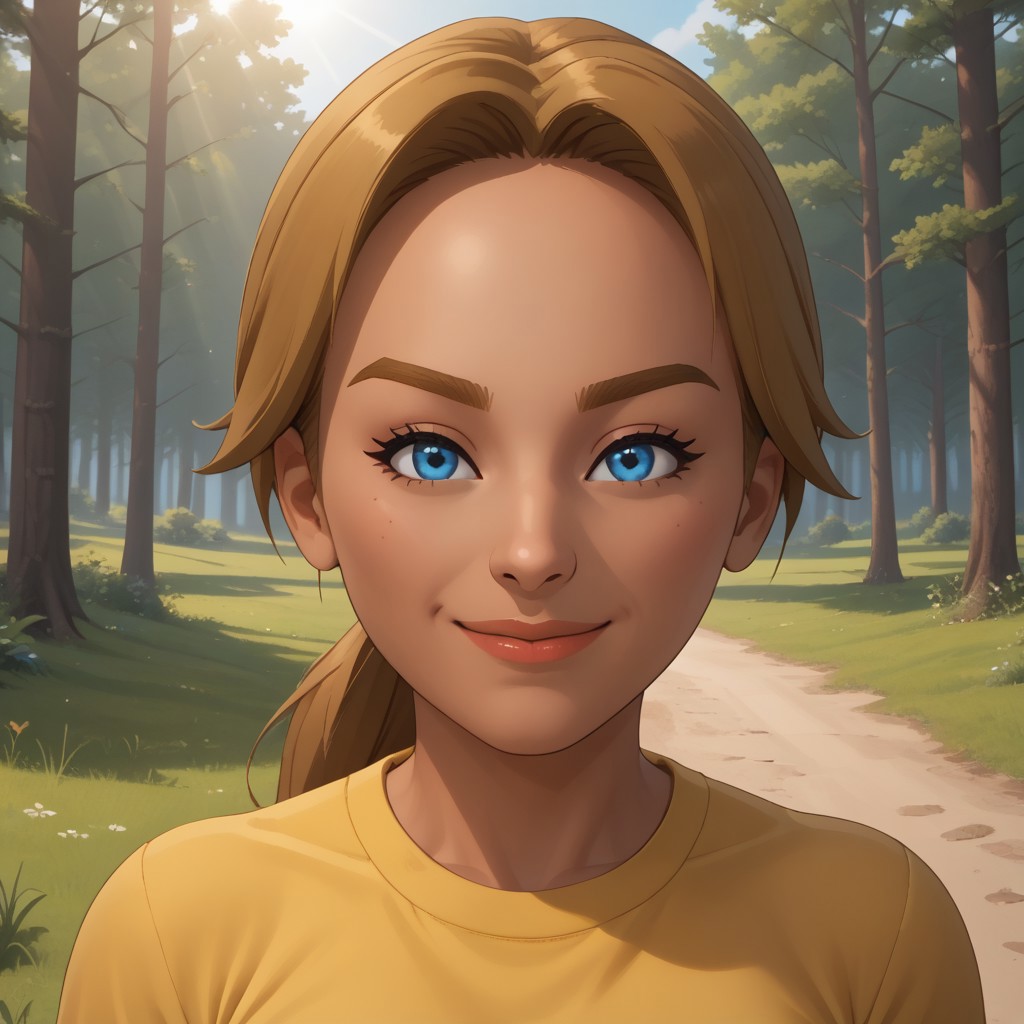 wii, mii, wii sports, 1girl, cute, female mii, dark skin, dark skin female, dark blonde hair, ponytail, dark blonde eyebrows, blue eyes, lips, yellow clothing, white pants, barefoot, MiaWSR, breasts, nintendo mii, modern_mii, classic_mii