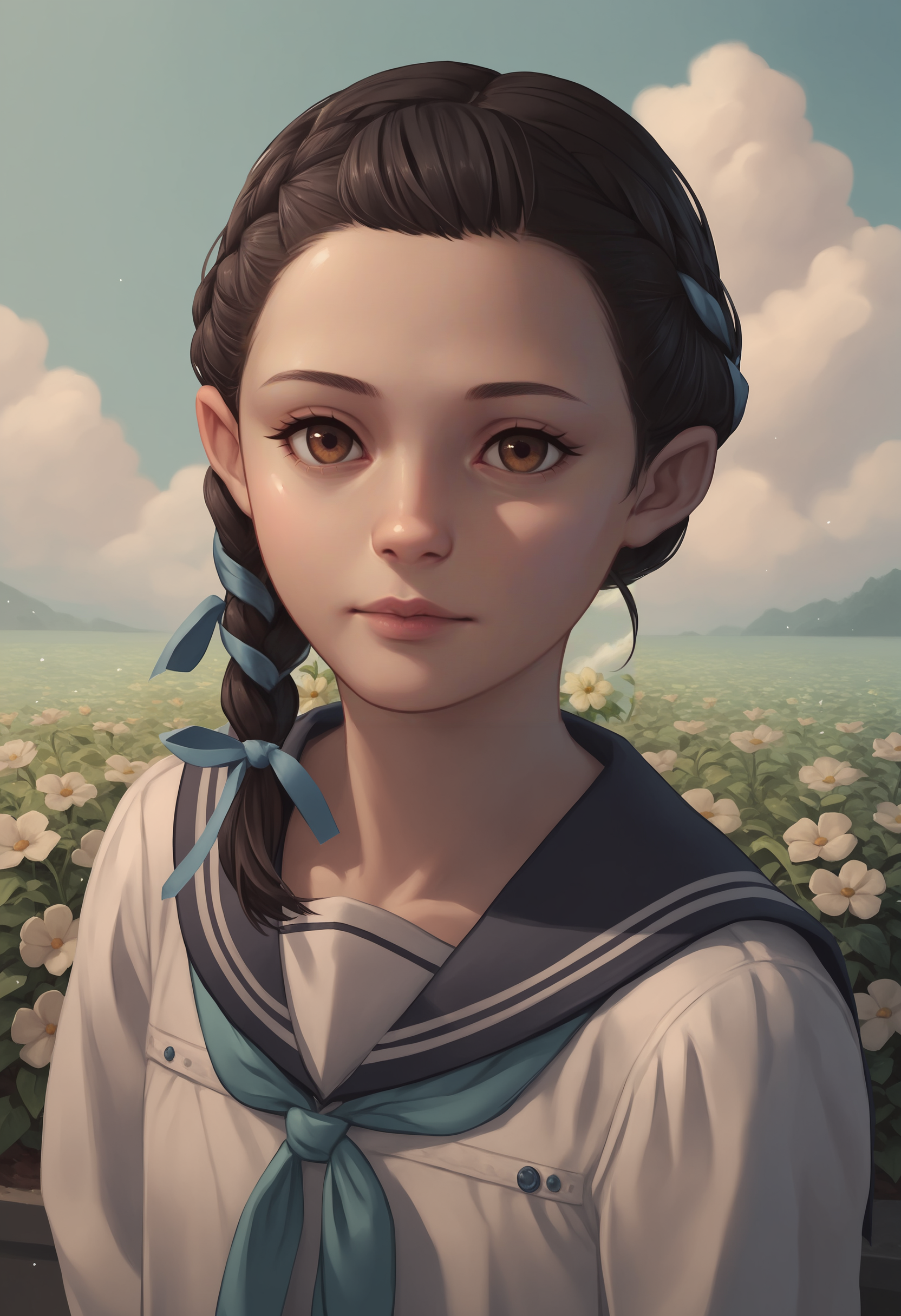 • Natalia: n4tilf, 1girl, brown eyes, brown hair, braid, blue ribbon, white dress