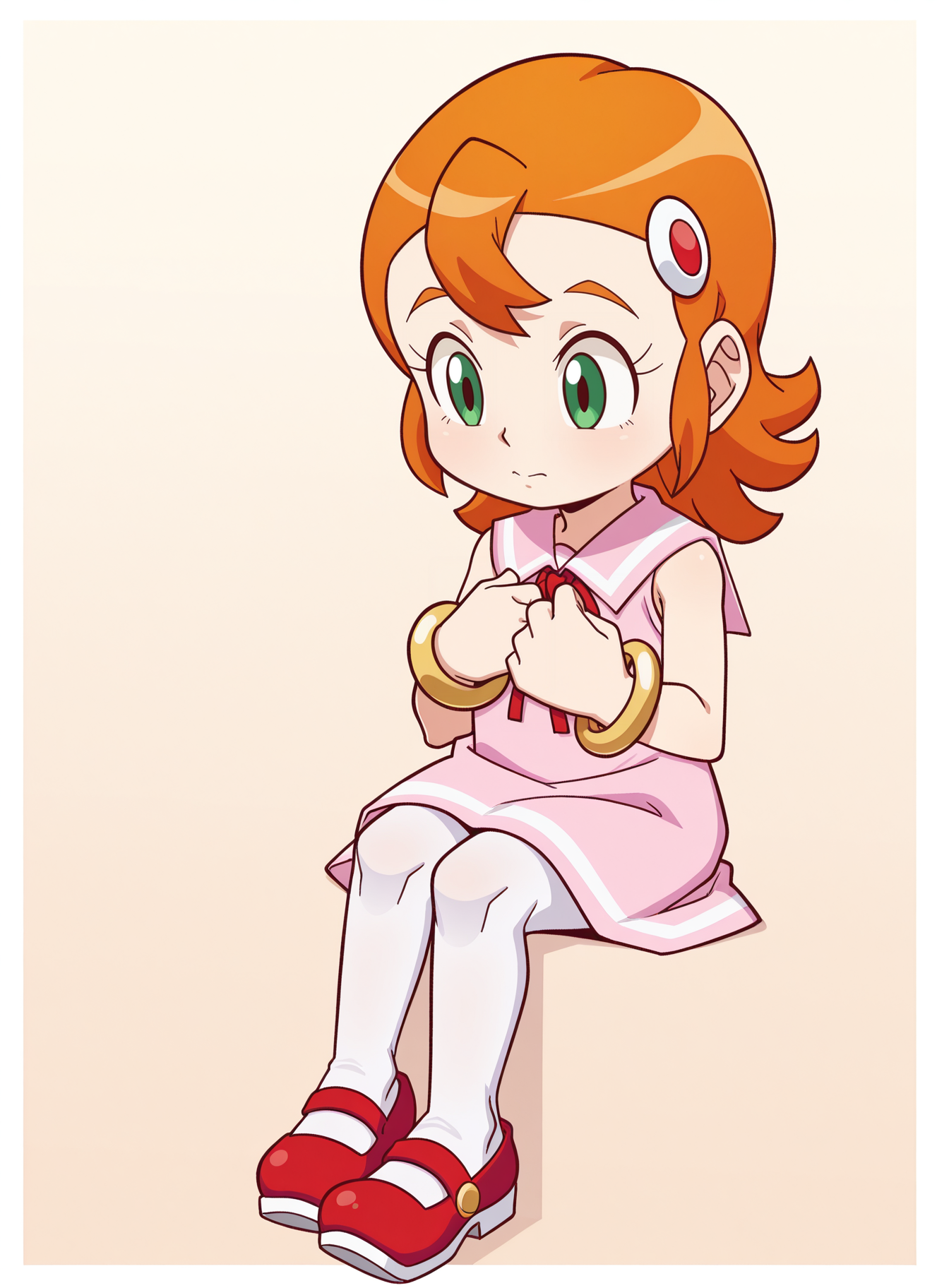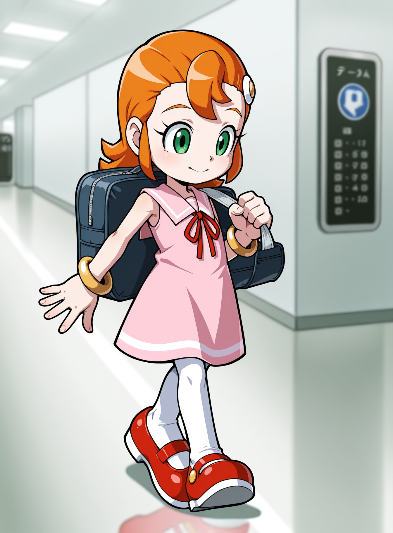 pink dress, red ribbon, neck ribbon, sleeveless dress, pink sailor collar, white pantyhose, gold bracelet, red footwear, mary janes, hair ornament