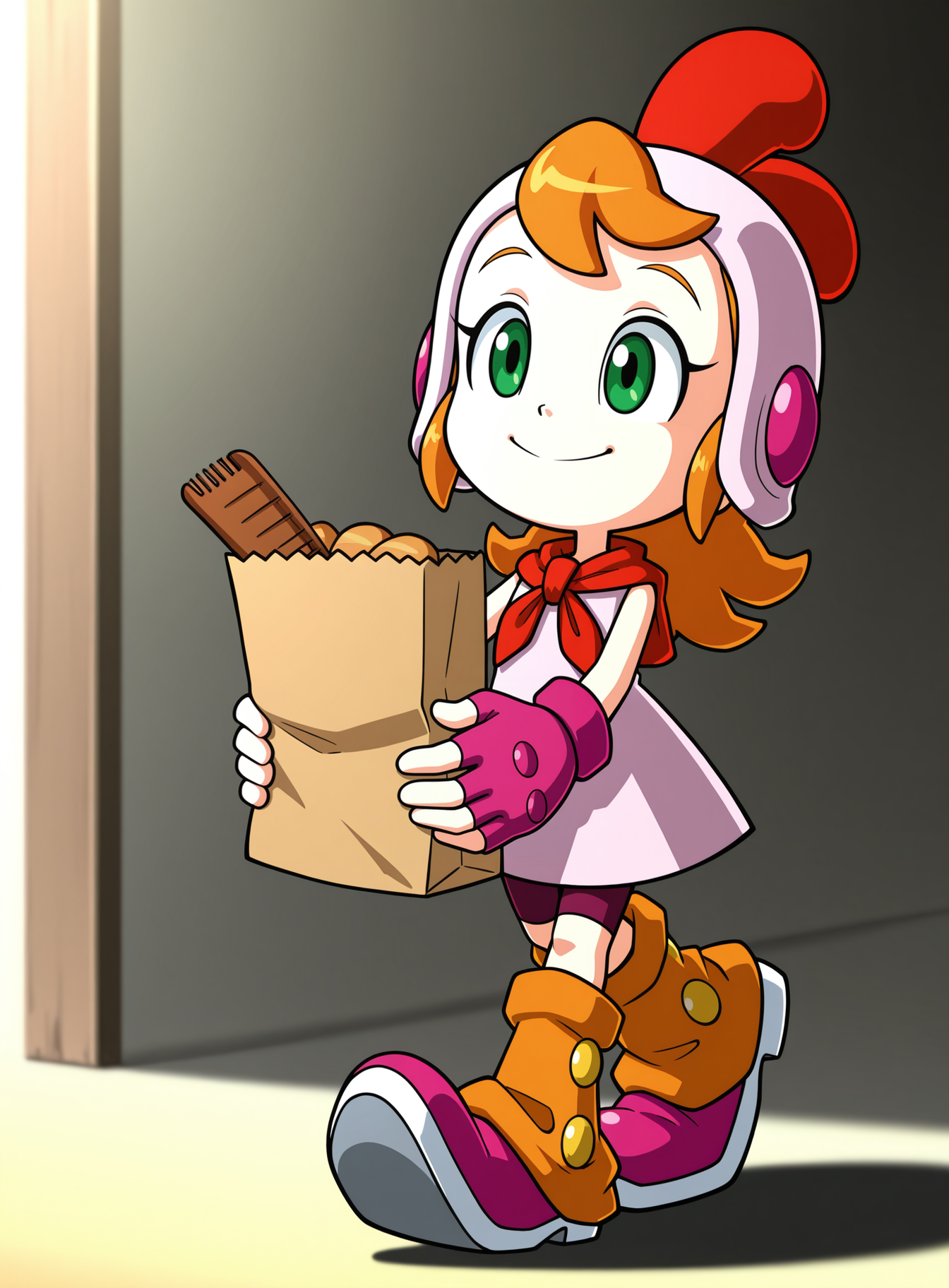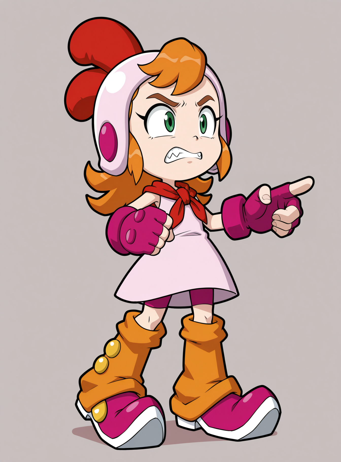 pink headwear, helmet, comb \(chicken\), chicken costume, pink dress, sleeveless dress, red neckerchief, purple shorts, bike shorts, purple footwear, orange gaiters, purple gloves, fingerless gloves